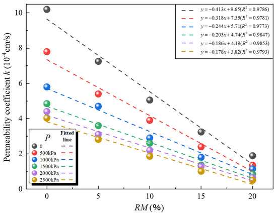 The relationship between the permeability coefficient and the RM of rubber-modified calcareous sand under different deviatoric stresses is shown in Figure 12. According to Figure 8, as the RM increased, the permeability coefficient of the rubber-modified calcareous sand gradually decreased under the same axial pressure. When the deviatoric stress was 0 kPa, the slope of the curve of the graph of the permeability coefficient vs. RM of the sample was 0.413, and when the deviatoric stress increased to 2500 kPa, the slope of the graph of the permeability coefficient vs. RM decreased to 0.178. This showed that, as the axial stress increased, the influence of the RM on the permeability of rubber-modified calcareous sand gradually weakened. This was because, when the deviatoric stress was between 0 kPa and 1000 kPa, the pores inside the sample were not completely compressed, and the rubber fiber was deformed under the stress and filled the pores of the calcareous sand particles. With the increase in the RM, the pores of the calcareous sand particles were more fully filled by the rubber particles, and the permeability of the sample was effectively reduced. When the deviatoric stress was between 1500 and 2500 kPa, the pores between the calcareous sand particles were completely compressed, and the fine particles produced by the friction between the calcareous sand particles filled the original pores to a certain extent. At this time, the decreased permeability coefficient of the sample was limited, and the influence of the RM on the permeability of the sample gradually weakened.