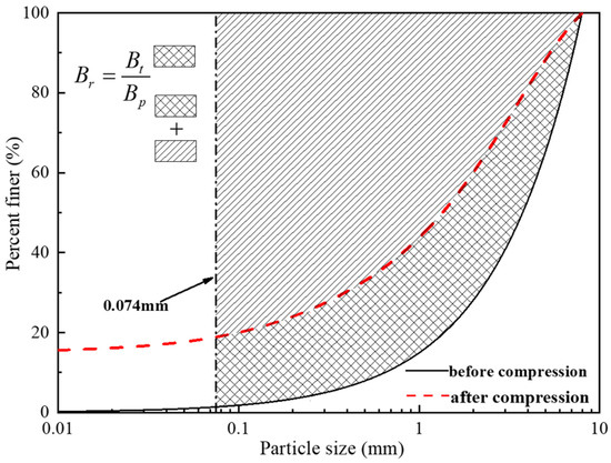 Particle breakage is a complex process related to the particle size, particle size distribution, particle shape, void ratio, and particle hardness. The most intuitive manifestation of particle breakage is the difference in the particle gradation curve before and after sample compression. Many scholars take the change at a certain point on the particle grading curve as an indicator of particle breakage. In this study, the breakage model proposed by Hardin [45] was adopted to evaluate the degree of breakage of particles, and the area enclosed by the particle grading curve before compression and the vertical line with particle size D equal to 0.074 mm was defined as the initial breakage potential BP0. It was considered that the particles less than the upper limit of 0.074 mm did not continue to break. The area of the particle gradation curve after compression and breakage and the initial gradation curve and the vertical line with particle size D equal to 0.074 mm were defined as the total breakage Bt (Figure 13). Then, the ratio of the total breakage Bt to the initial breakage potential BP0 was defined as the relative breakage rate Br, as shown below: