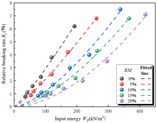 According to the test results, the relationship between the input energy WP and the relative breakage rate Br under different RMs is shown in Figure 14. The degree of breakage of the calcareous sand particles was closely related to the energy absorbed during the stress process and the RM value of the sample. For different RMs, the relationship between WP and Br could be fitted by a power function as shown in Equation (10). The curve-fitting formulae for different RMs are shown in Table 5.