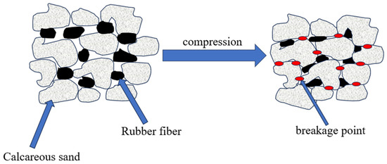 In addition, with the same input energy, the relative breakage rates were much smaller for samples with larger RM values than for samples with smaller RM values. There were two main reasons for this behavior; (1) As shown in Figure 16, it can be found that the pores of calcareous sand contain a large number of rubber particles. The presence of rubber fibers reduced the stress concentrations between calcareous sand particles, thus reducing the breakage of particles. (2) The rubber fibers will serve as a skeleton to bear a portion of the load and undergo deformation under the action of the load, thereby absorbing some of the input energy [38,39].