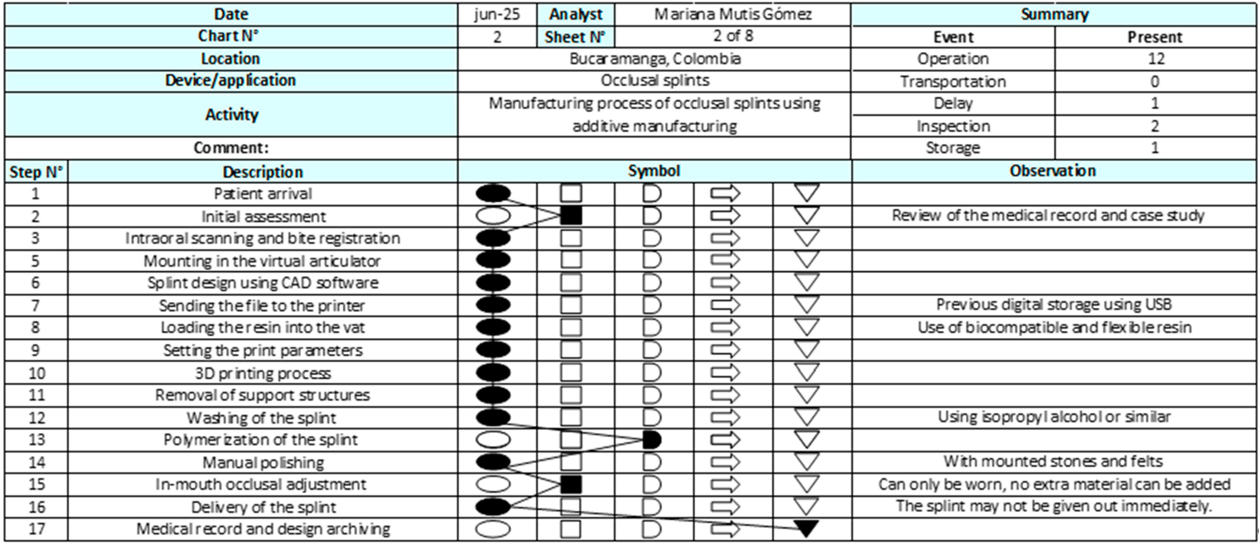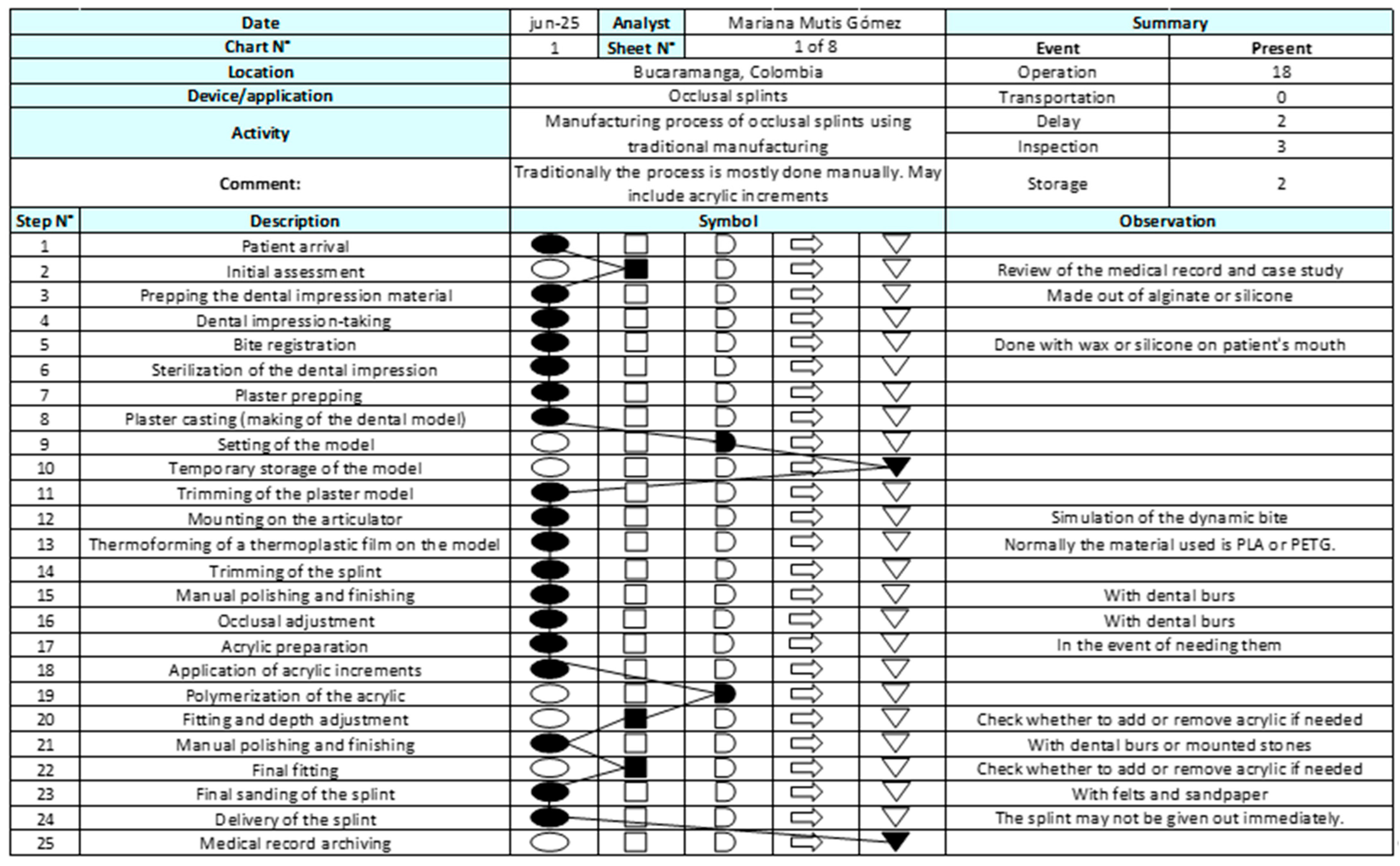 | Occlusal splints | Molding with plaster and alginate. Occlusal (bite) registration using wax to determine centric relation. Design and fabrication with techniques such as lost wax, thermoforming, dusting, etc. Manual finishing (sanding). | Molding with plaster and/or CAI assisted. Device design in CAD software. Machining processes (milling, turning, etc.) performed on a block of material (resin). Finishing includes cleaning and sanding, but less manual adjustment. | Molding with plaster and/or CAI assisted. Device design in CAD software. Fabrication of the piece assisted by CAM technology and 3D printing. Finishing includes resin curing, cleaning and sanding, but less manual adjustment. | [14,121,122] |