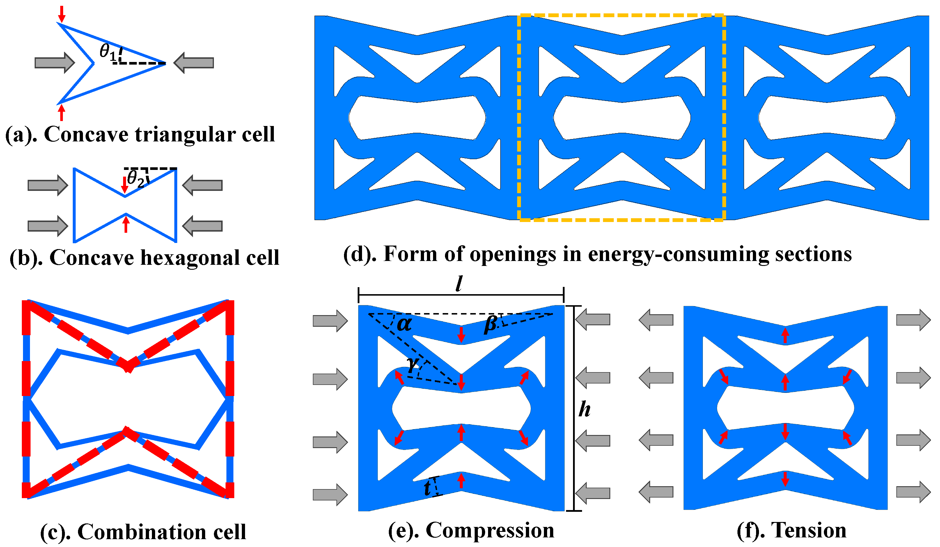- Kun, Y.; Fei, T.; Bo, W.Y.; He, H.Y. Study on impact energy absorption performance and optimization of negative Poisson’s ratio structure. J. Braz. Soc. Mech. Sci. Eng. 2023, 45, 328. [Google Scholar] [CrossRef]