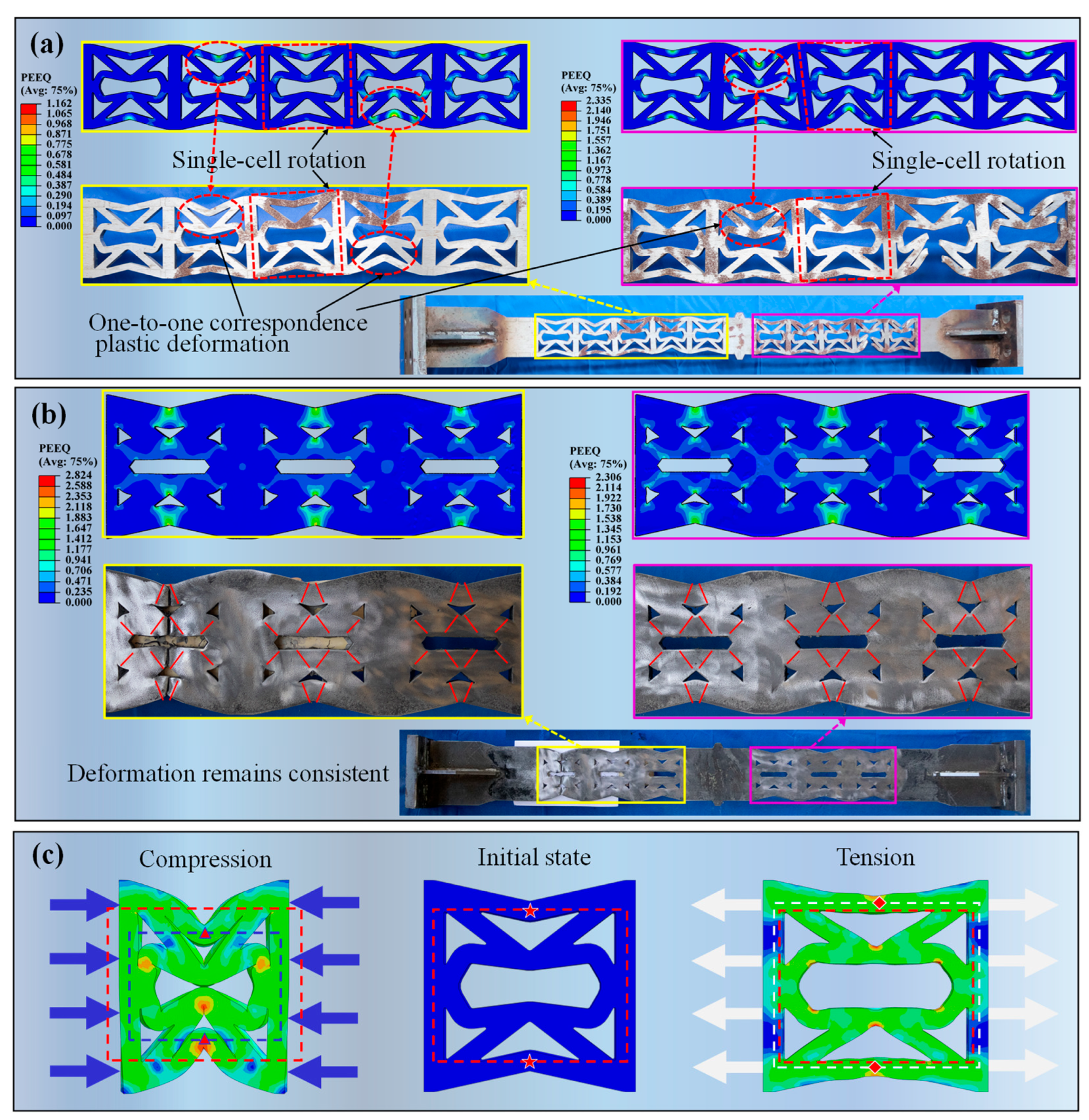 - Nickabadi, S.; Sayar, M.A.; Alirezaeipour, S.; Ansari, R. Optimizing an auxetic metamaterial structure for enhanced mechanical energy absorption: Design and performance evaluation under compressive and impact loading. J. Sandw. Struct. Mater. 2024, 26, 1129–1164. [Google Scholar] [CrossRef]