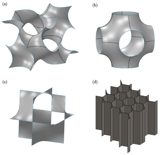 (a) Gyroid, (b) Primitive, (c) Diamond, and (d) Honeycomb Lattice Designs.