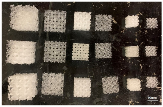 Figure 4 shows the successful prints from the resolution testing. A total of 18 different cell sizes were successfully printed, with three different cell sizes, three different thicknesses, and two different heights. Thicknesses of 0.1 mm to 0.5 mm were tested, and it was found that 0.25 mm to 0.5 mm of thickness was a suitable range. For the cell sizes, 3.175 to 12.7 mm per cell was tested, and 6.35 to 12.7 mm was found to be the suitable range. For height, it was found that a height three times the cell size was common in Honeycomb, leading to the 3 × 3 × 1 cell size and 3 × 3 × 3 cell size test specimen samples. The 3 × 3 × 1 unit cell size sample is meant to replicate the Honeycomb typically used in aerospace applications, and the 3 × 3 × 3 unit cell size sample is intended to test the abilities of the TPMS replication properties compared to the honeycomb. The parameterized design made it easy to adjust and test these sizes for printing.