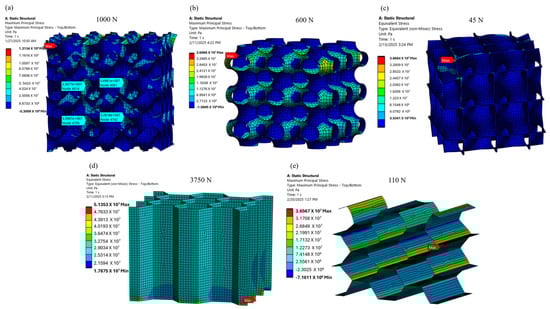 Failure Stress of (a) Gyroid, (b) Primitive, (c) Diamond, (d) Honeycomb Axial, and (e) Honeycomb Transverse.