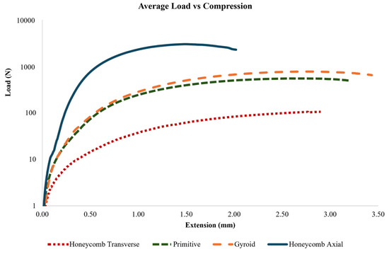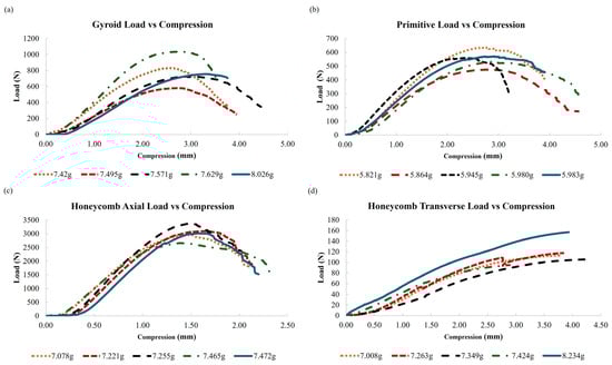 Load vs. Compression of (a) Gyroid, (b) Primitive, (c) Honeycomb Axial, and (d) Honeycomb Transverse.