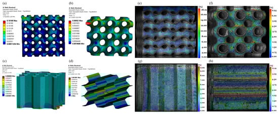 Localized von Mises Strain of (a) Gyroid, (b) Primitive, (c) Honeycomb Axial, and (d) Honeycomb Transverse Simulations and Localized von Mises Strain of (e) Gyroid, (f) Primitive, (g) Honeycomb Axial, and (h) Honeycomb Transverse DIC Testing.