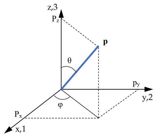 A fiber (vector) of unit length p can be represented by the projection of its components onto the x, y, and z axes at angles θ and φ: