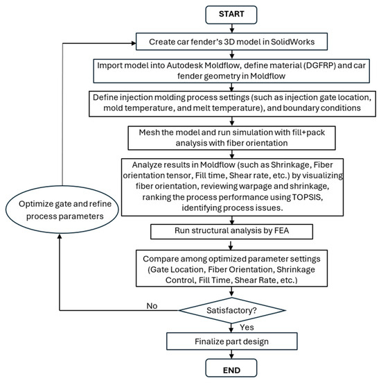 A car fender is a highly representative example of a component that can be used to fully explore and validate the advantages of computer modeling for the injection molding of DFRP parts. The complexity of the part’s geometry and the material’s anisotropic properties, balancing shrinkage, the fiber orientation, and dimensional stability, are critical. The demands for high performance and manufacturability make this an ideal case study for the validation of injection molding process design using computer modeling [28,29,30,31,32,33]. In this study, a car fender, composed of discontinuous glass fiber-reinforced polypropylene (DGFRP) composites, was chosen. The design of the injection molding process for the production of car fenders was performed by computer modeling using Moldflow Insight 2024. The effects of various process parameters, particularly the gate placement, on the most important characteristics of the injection part, such as the fiber orientation, volumetric shrinkage, and shear rate, were investigated. A multicriteria decision-making (MCDM)-based Technique for Order of Preference by Similarity to Ideal Solution (TOPSIS) was adopted to determine the optimal gate placement to achieve optimal performance, i.e., lower shrinkage, a consistent fiber orientation, and a manageable shear rate, resulting in excellent dimensional accuracy and process stability. The reduced strain closure (RSC) model (a refined Folgar–Tucker model) was used to predict the glass fiber orientation.