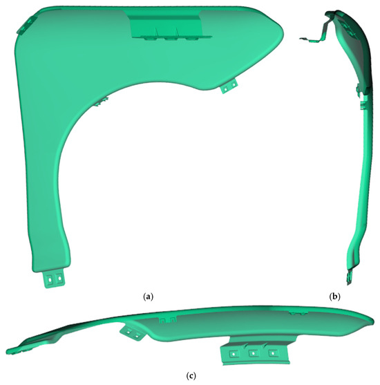 This study uses the front fender of an automobile part with a complex geometry as a case study. Car front fenders are essential for both safety and aesthetic reasons. They block road debris, prevent damage to the vehicle body, and contribute to the vehicle’s aerodynamic profile (smooth surface and curved surfaces). In particular, in the event of a collision, fenders can absorb the impact energy, minimize damage to the passenger compartment, and potentially reduce the severity of injuries. The front fenders have traditionally been composed of steel or aluminum. However, the materials used for fenders have evolved over time, especially in the field of lightweight vehicles, aiming at improving their fuel efficiency and corrosion resistance. In this study, the material of the car fender was composed of a discontinuous glass fiber-reinforced polypropylene (DGFRP) composite (manufacturer: Japan Polypropylene Corporation, Tokyo, Japan). The material properties were provided by the Autodesk Moldflow Insight database [54]. The selection of the part material and the injection molding manufacturing process was based on factors such as vehicle design, cost considerations, the required performance characteristics (e.g., strength and lightness), and manufacturing techniques. Figure 3 schematically shows different views of the part drawing [55]. The car fender dimensions are 650 mm (height) × 1160 mm (width) × 235 mm (depth) × 2.8 mm (thickness). This study aims to analyze the effects of the injection molding process parameters, especially the gate placement, on the part quality (e.g., fiber orientation, defect formation (warpage and shrinkage), shear rate, etc.), in order to optimize these process parameters. Important process information and performance aspects, including the shear rate, shrinkage, and fiber orientation, were carefully examined. The injection molding simulation software Autodesk Moldflow Insight 2024 and MATLAB 2024a were used to evaluate the injection molding process and the overall behavior of the car fender part under various molding conditions.
