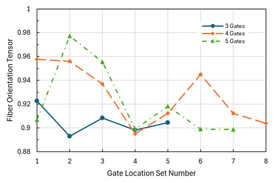 For glass fiber orientation analysis, modeling can provide insights into how short fibers align within the polymer matrix in the molded part, thereby predicting their spatial distribution and its impact on the final part properties. Figure 6 compares the fiber orientation tensor and gate location settings for different gate numbers. The results are crucial in understanding how the flow of fiber-filled plastics affects the material properties, shrinkage, and warpage, with the average result being particularly useful for thin parts. The fiber orientation tensor is a mathematical tool that represents the probabilistic alignment of fibers within a molded part. It is typically a second-order tensor (a 3 × 3 matrix). It quantifies the degree of alignment in specific directions, with values close to 1 indicating a strong preference for a particular orientation. For the three-gate case, five gate location sets were designed. The fiber orientation tensor values vary between 0.893 and 0.923, and gate set #1 reaches the highest value of 0.923, while gate set #2 reaches the lowest value of 0.893. For the four-gate case, eight gate location sets were designed. The fiber orientation tensor values vary between 0.895 and 0.958, and gate sets #1 and #2 reach the highest values of about 0.957–0.958, while gate set #4 reaches the lowest value of 0.895. For the five-gate case, seven gate location sets were designed, and the fiber orientation tensor values vary between 0.899 and 0.977. The fiber orientation tensor reaches the highest value of 0.977 for gate set #2, much higher than those at the other gate locations, and gate sets #4, 6, and 7 reach the lowest values of about 0.899. A higher degree of fiber alignment is crucial for achieving better mechanical properties, structural integrity, and performance consistency in injection-molded DGFRP car fenders.