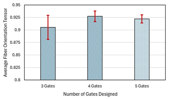 To determine the consistency of fiber alignment, a standard deviation index can be used. A lower standard deviation is directly correlated with fewer fluctuations and higher uniformity in the fiber orientation, better mechanical integrity, a longer service life, and a more uniform stress distribution. Figure 7 summarizes the fiber orientation distribution analysis via a bar chart comparing the average fiber orientation tensor over the different gate location settings, with corresponding standard deviations for different gate numbers. For the three-gate case, the average value is 0.905, and the standard deviation is 0.024 (i.e., 0.905 ± 0.024). For the four-gate case, the results are 0.927 ± 0.011. For the five-gate case, the results are 0.922 ± 0.008, similar to the four-gate case and much lower than in the three-gate case.