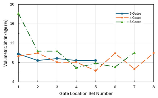 Volumetric shrinkage analysis predicts the dimensional changes that occur after part demolding due to the material properties and processing conditions, enabling designers to determine the correct mold shrinkage allowance required to achieve final part dimensions within the defined tolerance. Figure 8 shows the relationship between the volumetric shrinkage and the gate location setting for different gate numbers designed in the car fender sample, indicating the dimensional stability and deformation probability of the molded product. The lower the volumetric shrinkage, the better.