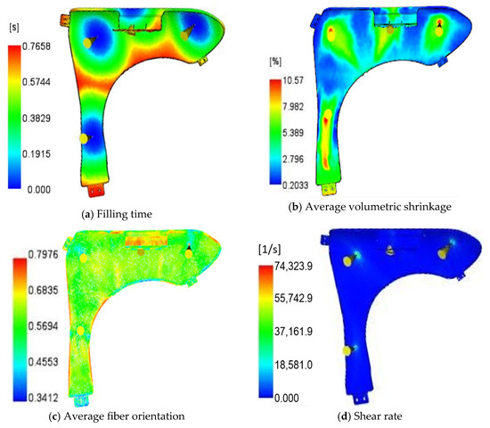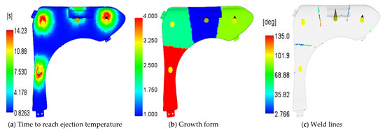 Additional process characteristics of the sample for the optimal gate configuration (four-gate) with the corresponding gate locations (gate location set #2) are shown in Figure 11, including (a) the time to reach the ejection temperature, (b) the injection material growth form, (c) weld lines, (d) the average fiber length, (e) the pressure at the end of filling, and (f) filling path lines.