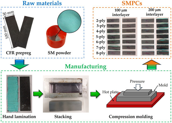 The entire manufacturing process is shown in Figure 1. CF prepreg plies have been extracted from the supplied roller with nominal dimensions 30 × 100 mm2. Nominal interlayer thicknesses of 100 μm and 200 μm were manufactured by using a mass of the uncured epoxy resin of 0.43 g and 0.86 g, respectively. The powder was manually deposited on the prepreg surface, avoiding gaps and ensuring uniform distribution. Hand lamination was performed to obtain the stacking sequence of the proposed architectures. The uncured SMPCs were positioned in an aluminum mold with a rectangular cavity of 30 × 100 mm2 for consolidation. A polyethylene film was placed between the mold and the laminate to promote releasing. Curing was carried out via compression molding on a hot plate at 200 °C and 70 kPa for 1 h. After cooling, the SMPCs were extracted from the mold and tested.