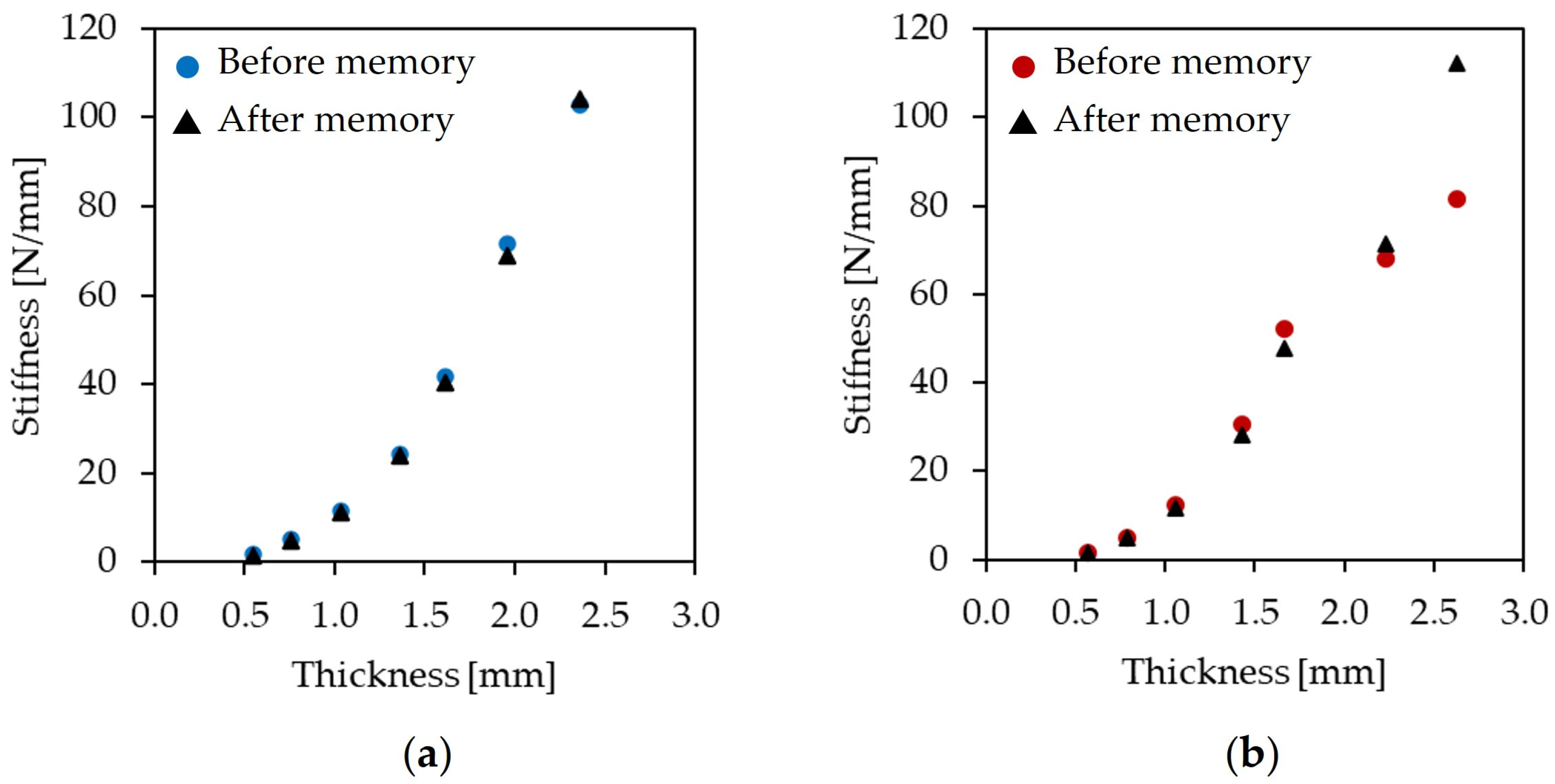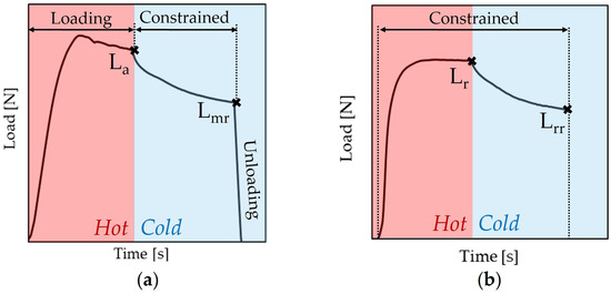 Exemplificative curves (SMPCs eight-ply, 100 μm interlayer) of the processes described above have been reported in Figure 3. Figure 3a shows the memory curve and highlights the reference loads: the applied load (La) and the memory residual load (Lmr). On the other hand, Figure 3b refers to the measurement of the recovery load (Lr) and the residual recovery load (Lrr). Data normalization was performed after testing and the corresponding stresses were extracted: applied memory stress (σa), residual memory stress (σmr), recovery stress (σr) and residual recovery stress (σrr). Furthermore, Rf and Rr were measured using the following equations: