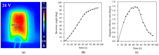SMPC device with embedded microheater: (a) thermography; (b) recovery angle; (c) angular velocity rate during recovery.