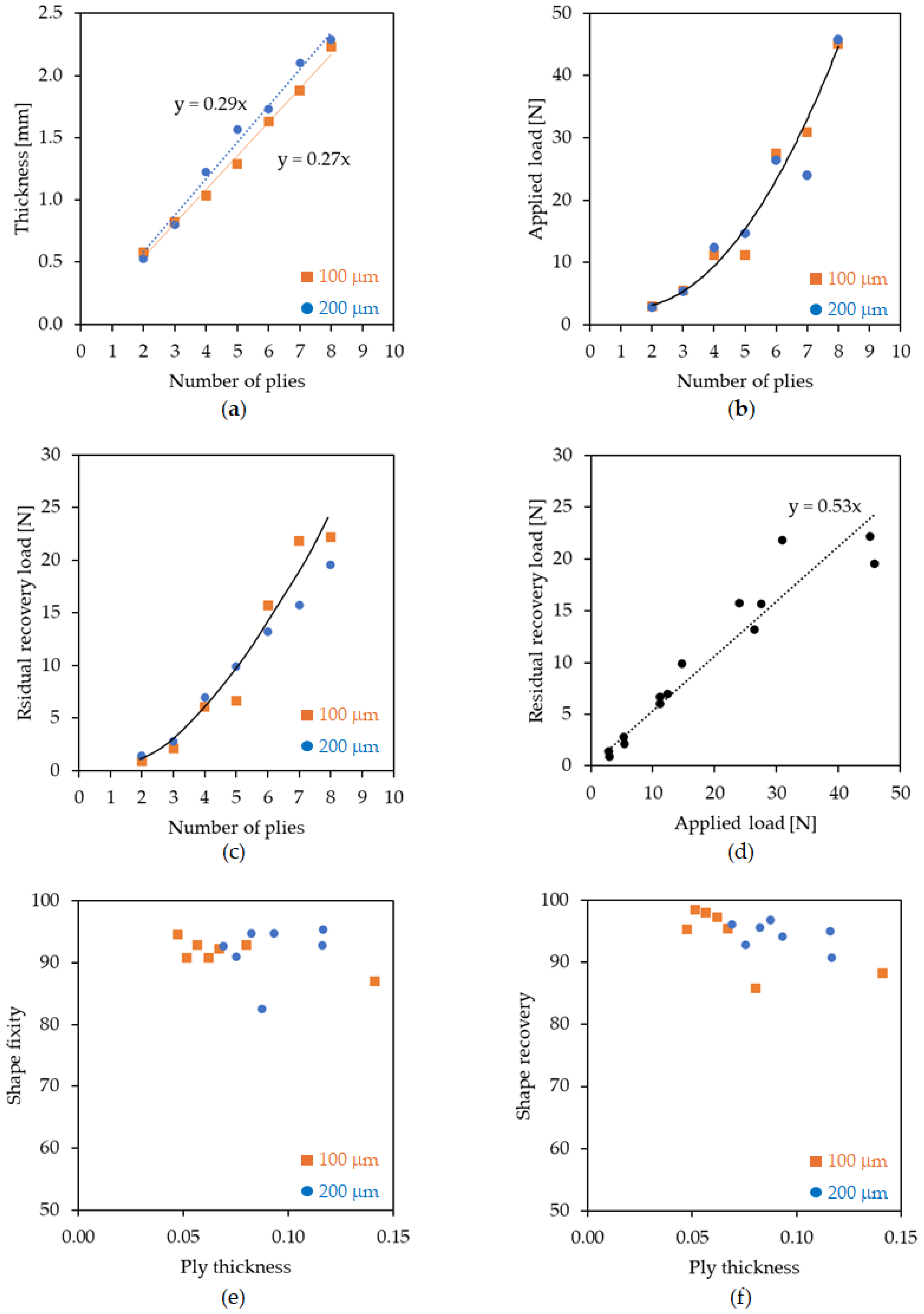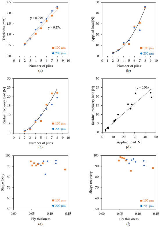 Correlation of physical and SM ability between SMPCs with 100 and 200 μm interlayers: (a) number of composite plies/thickness; (b) number of composite plies/applied load (i.e., La—load at the end of the heating step of memory test); (c) number of composite plies/residual recovery load (i.e., Lrr—load at the end of the cooling step of the recovery load test); (d) applied load (La)/residual recovery load (Lrr); (e) cured composite ply thickness/shape fixity (Rf); (f) cured composite ply thickness/shape fixity (Rr).