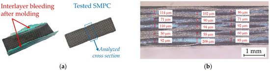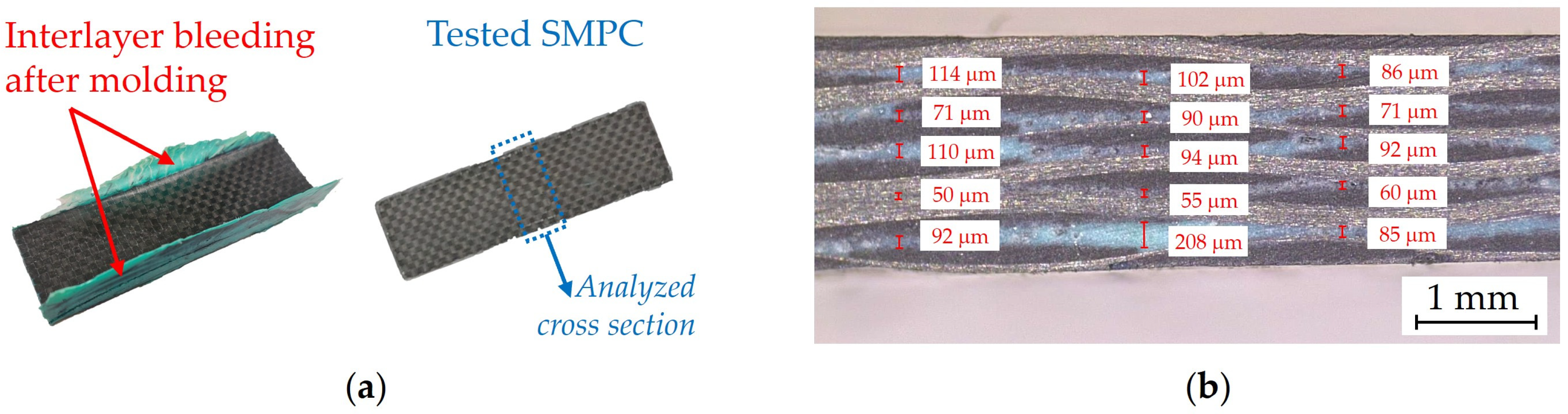 SMPC with six carbon fiber plies and five interlayers of initial thickness: 200 μm. (a) Manufactured laminate; (b) cross section.
