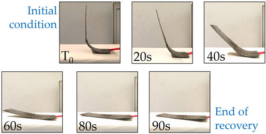 The prototype thickness was measured, and it was memorized with a bending angle of 90°, using an aluminum cylindrical mold with a diameter of 17 mm. Shape recovery was investigated by connecting the embedded microheater to a power supply at 24 V, and an infrared camera (883 by Testo) was used to ensure that the achieved temperature was sufficient to activate the SM behavior. Both the recovery angle and the angular velocity were evaluated, with the recovery test lasting for 90 s.