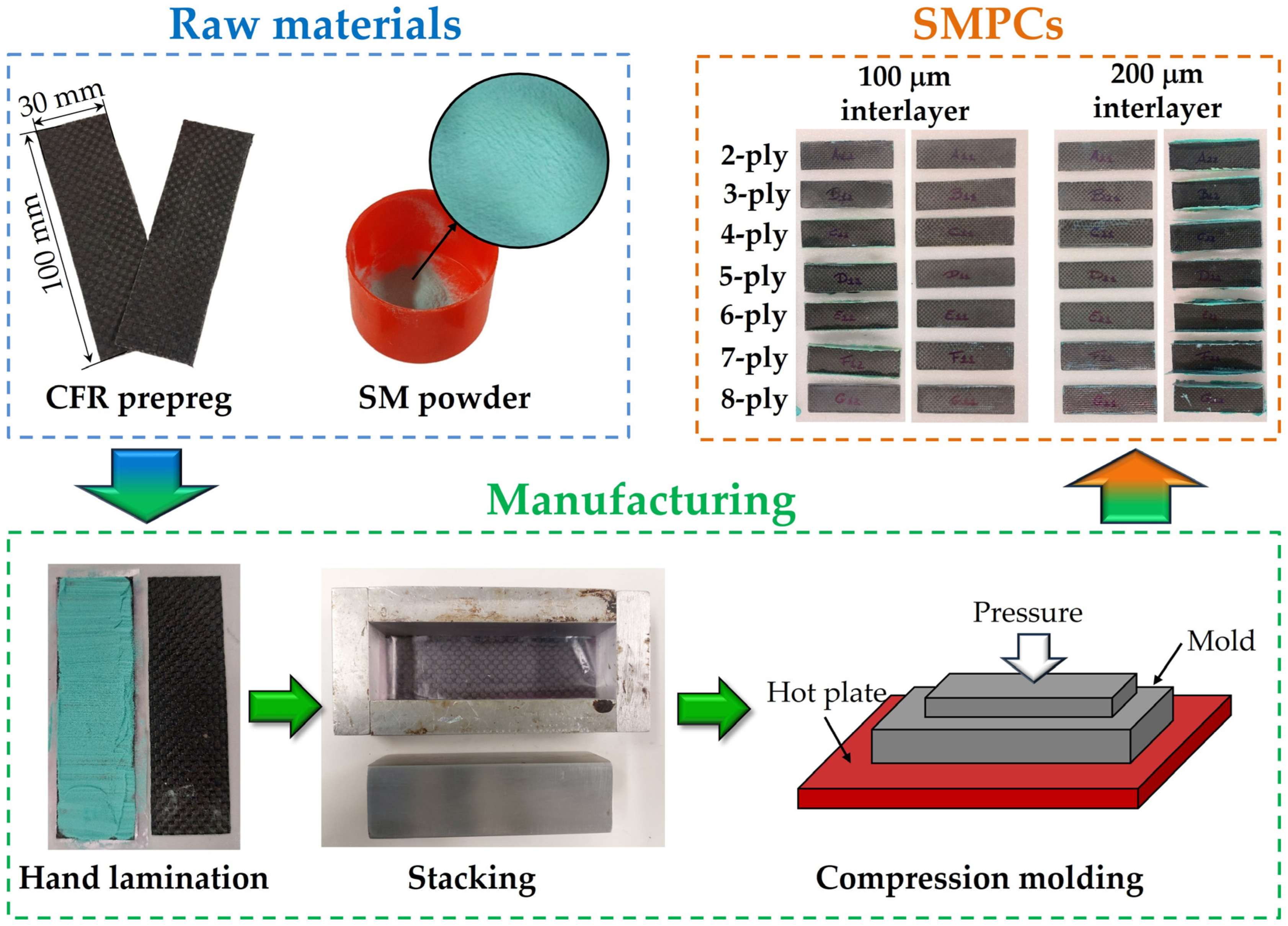 Manufacturing of SMPCs using hand lamination and compression molding.