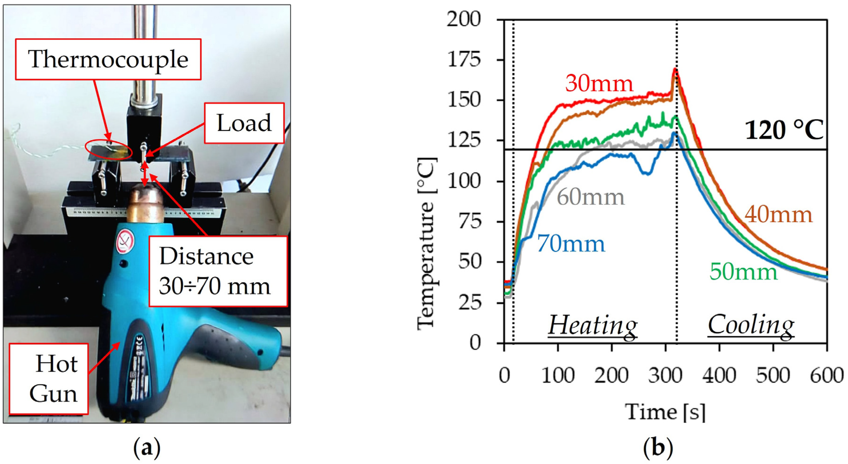 A temperature calibration test was conducted to determine the appropriate distance between the composite laminate and the tip of the hot gun used to trigger the SM effect. To ensure its activation, the Tg of the epoxy resin (i.e., 120 °C) had to be reached, and thus temperature changes in time had been recorded during the test. The resulting curves are shown in Figure 2b, and a distance of 50 mm was selected to perform memory tests, since a heating plateau temperature of 128 °C was recorded. On the other hand, at the distances of 70 mm and 60 mm, the plateau temperatures were 111 °C and 118 °C, respectively, while 145 °C and 150 °C temperatures were obtained at 40 mm and 30 mm.