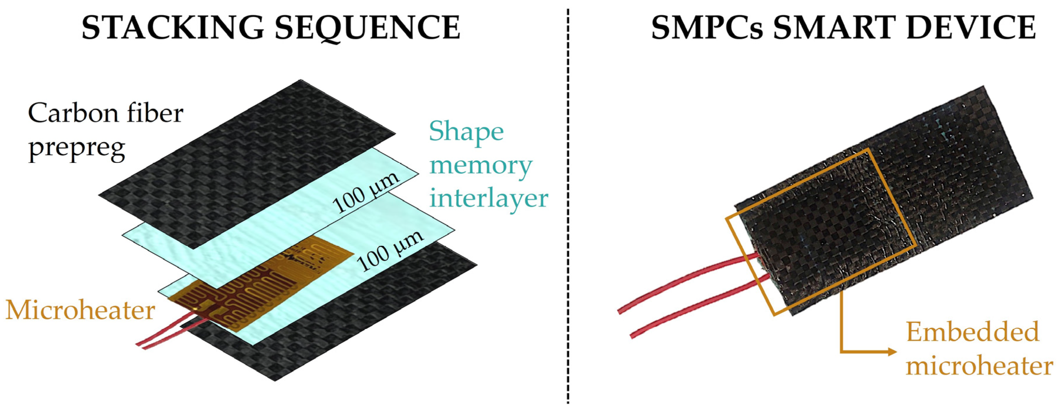 SMPCs [28] with SM interlayers have already been tested in a space environment, showing promising results in terms of actuation load and shape recovery. The foam and the interlayer were made using the same uncured epoxy powder that has also been used in this study. The aim of the present work is to design SMPCs architectures that can potentially be used to manufacture active structures in deploying systems. Consequently, SMPCs have been manufactured by changing either the number of composite plies (from one to eight) or the thickness of the interlayer (100 μm and 200 μm). Memory tests were performed, and the properties of the laminates have been extracted and correlated. In the end, a smart device was prototyped by integrating a local heat source into the laminate structure, and memory-recovery tests were conducted.