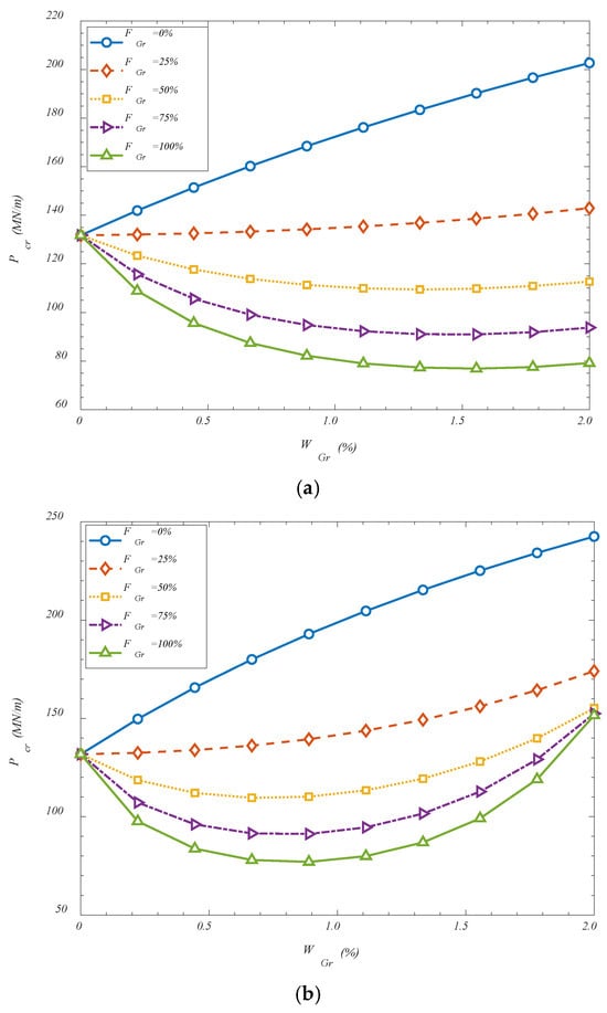 VGr-A) exhibits the highest sensitivity to shear stiffness, with a buckling load increase of nearly 46%, closely followed by the uniform and crosswise volume-based configurations. This indicates that non-uniform GOAM layouts—particularly those that align reinforcement with dominant stress paths—can more effectively exploit the benefits of a shear-interacting foundation. Configurations based on folding angle (
