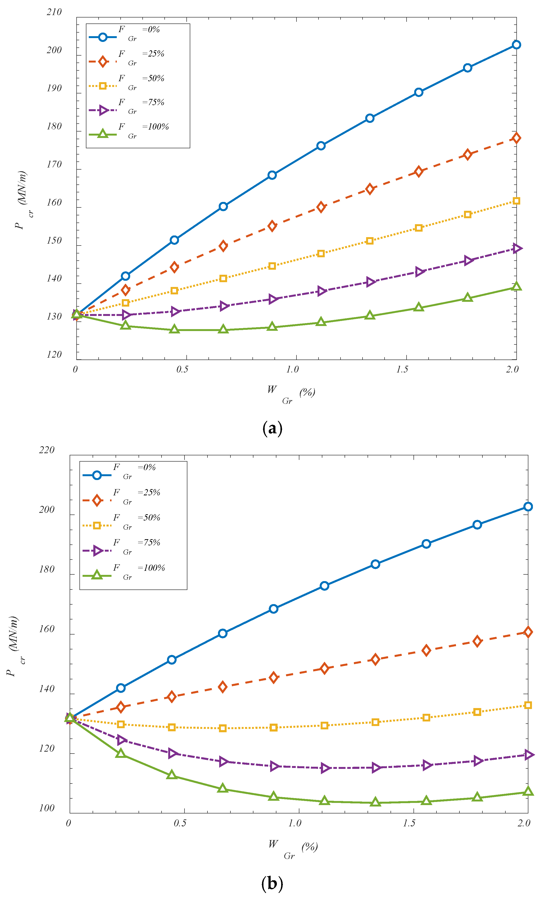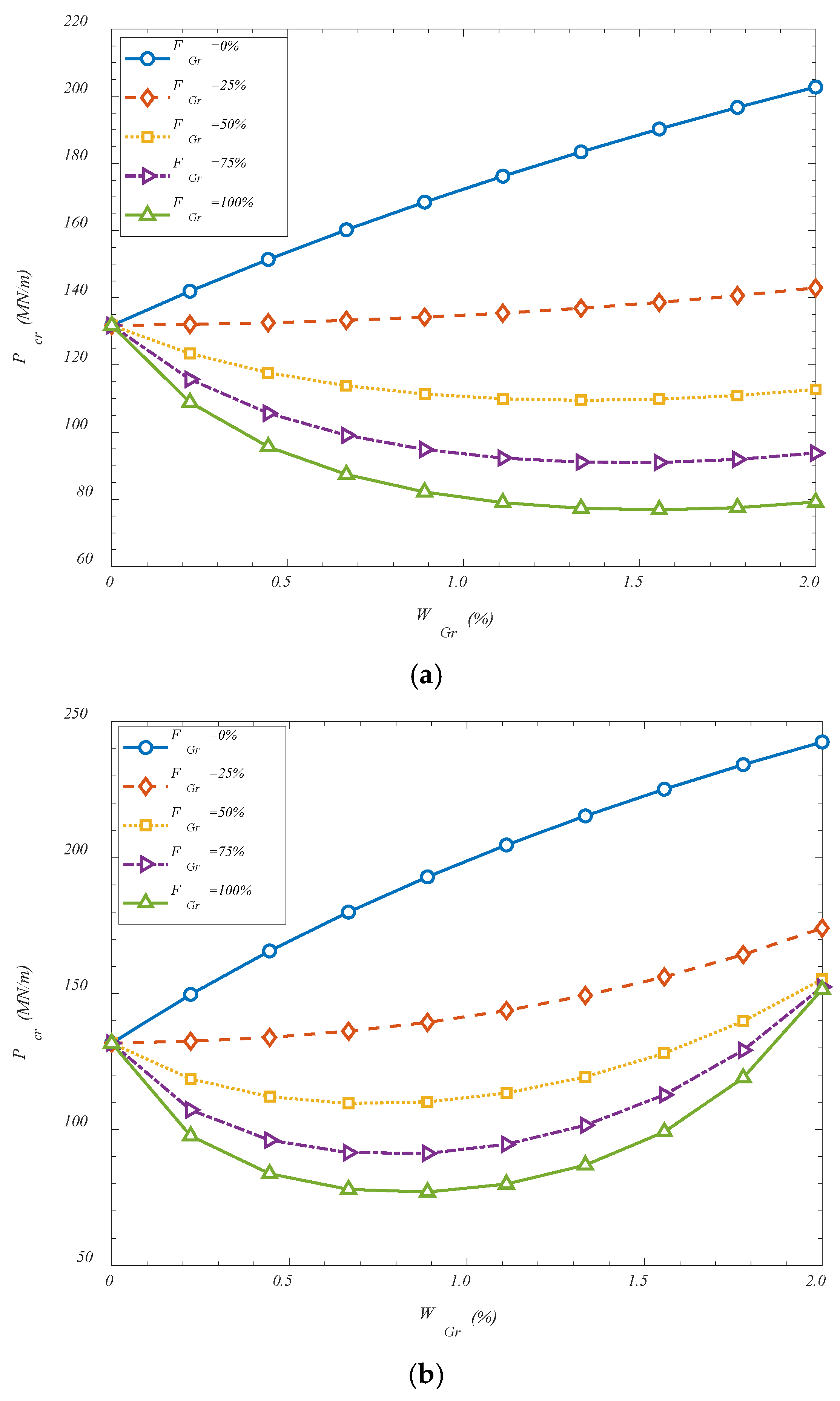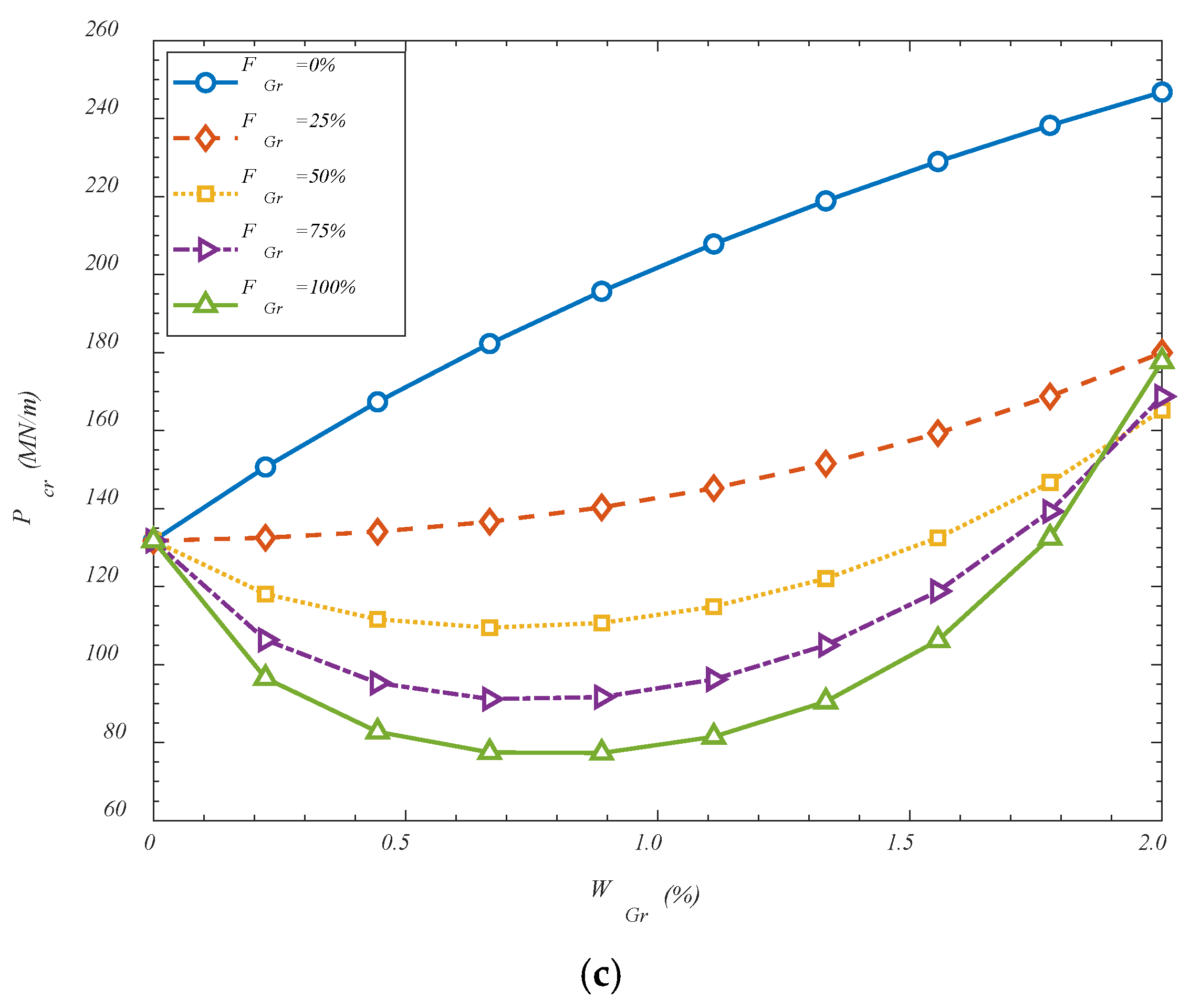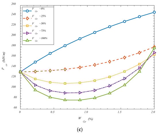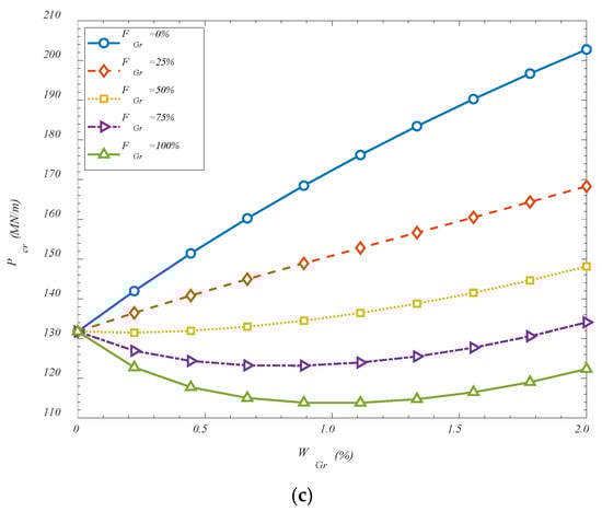 VGr-A. It is observed that an increase in the GOAMs’ weight percentage generally leads to a monotonic enhancement in the critical buckling load across all configurations when the folding degree is set to 0%. This trend is attributed to the significant mechanical contribution of the GOAMs, which act as stiffening reinforcements within the composite shell structure. As the weight percentage increases, the relative share of the auxetic phase rises, resulting in improved in-plane and out-of-plane stiffness. The auxetic nature of the GOAMs, characterized by a negative Poisson’s ratio, allows for better stress distribution under compressive loading, thereby delaying the onset of instability. The folding degree of the GOAM microstructure is also found to exert a notable influence on the structural stability. As the folding degree increases, a nonlinear rise in the critical buckling load is detected. This behavior may be explained by the fact that increased folding induces additional geometric complexity and microstructural interlocking, both of which enhance the resistance of the metamaterial against deformation. Folded configurations enable a more effective load transfer between the matrix and the reinforcement, while simultaneously altering the deformation pathway of the shell, thus increasing its buckling capacity. Among the three studied configurations, the