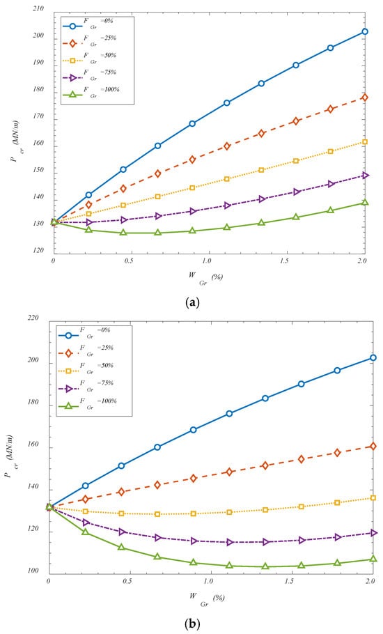 Figure 3. Similar to previous figure, it is observed that increasing the folding degree, leads the critical buckling loads to reduce. Although GOAMs are known for their potential to enhance structural stability, it has been observed in some configurations that increasing the folding degree can lead to a reduction in the critical buckling load. This behavior can be explained by considering the mechanical implications of excessive folding on the structural integrity of the reinforcement phase. As the folding degree increases, the overall continuity and in-plane stiffness of the GOAM network may become compromised due to the introduction of sharper geometrical discontinuities and more localized deformation zones. These highly folded configurations tend to exhibit increased flexibility and out-of-plane deformability, which may reduce their effectiveness in resisting global compressive loads. Furthermore, at higher folding degrees, the alignment between the GOAM microstructure and the primary load paths of the shell can become less efficient, causing a portion of the applied load to be absorbed through non-structural deformation modes such as twisting or localized bending. This redistribution of stress away from the load-bearing directions can lead to a premature onset of instability. Additionally, the folded architecture, while beneficial for energy absorption and local adaptability, may reduce the effective cross-sectional area contributing to axial stiffness, thereby diminishing the shell’s overall capacity to resist buckling. Therefore, while moderate folding can introduce beneficial auxetic behavior and controlled stiffness enhancement, excessive folding may instead introduce compliant mechanisms that undermine the shell’s ability to sustain compressive loads, ultimately resulting in lower critical buckling thresholds. Also, the contrasting influence of the GOAM weight percentage on critical buckling loads at different folding degrees can be explained by examining the interaction between the material’s effective stiffness and its structural geometry. When the folding degree is set to zero, the GOAM phase behaves similarly to a planar or nearly flat reinforcement layer. In this configuration, increasing the GOAM weight percentage directly increases the overall stiffness of the composite shell due to the superior mechanical properties of graphene-based auxetic metamaterials. The reinforcement is able to align effectively with the load paths, leading to improved load-bearing capacity and, consequently, enhanced critical buckling resistance. However, when the folding degree reaches 100%, the mechanical role of the GOAM phase changes fundamentally. At such high folding levels, the microstructure becomes highly corrugated, introducing significant geometric nonlinearity and local flexibility. Although more material is present as the weight percentage increases, a larger portion of this material becomes geometrically ineffective in resisting global compressive loads. Instead of contributing to in-plane stiffness, the folded GOAM regions are prone to local bending, twisting, or unfolding-type deformations that absorb energy without offering substantial resistance to buckling. As a result, the structural benefit of additional GOAM content is diminished or even reversed. Moreover, increasing the GOAM weight percentage at high folding degrees introduces a larger volume of flexible, folded microstructure, which can act as mechanical imperfections or localized soft zones. These regions may amplify instability by introducing stress concentrations or altering the global deformation pattern of the shell. Therefore, while the material content is increased, the effective stiffness in the load-bearing direction may be reduced, leading to a decrease in the critical buckling load. This behavior underscores the importance of coupled optimization between the material distribution and geometric configuration of the metamaterial phase. Simply increasing the quantity of GOAMs does not guarantee improved performance—particularly when the geometric folding alters the mechanical response in a non-beneficial manner.