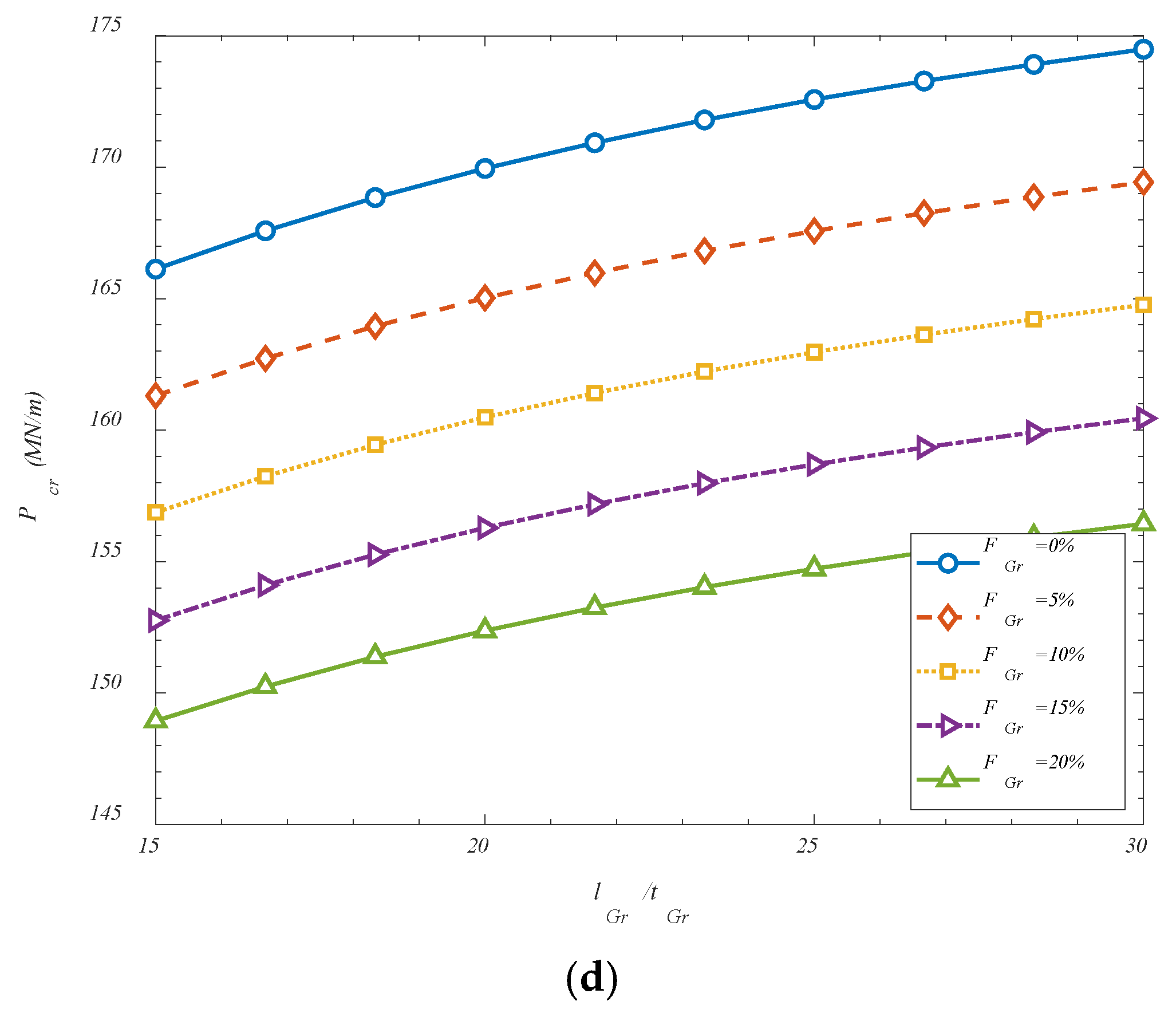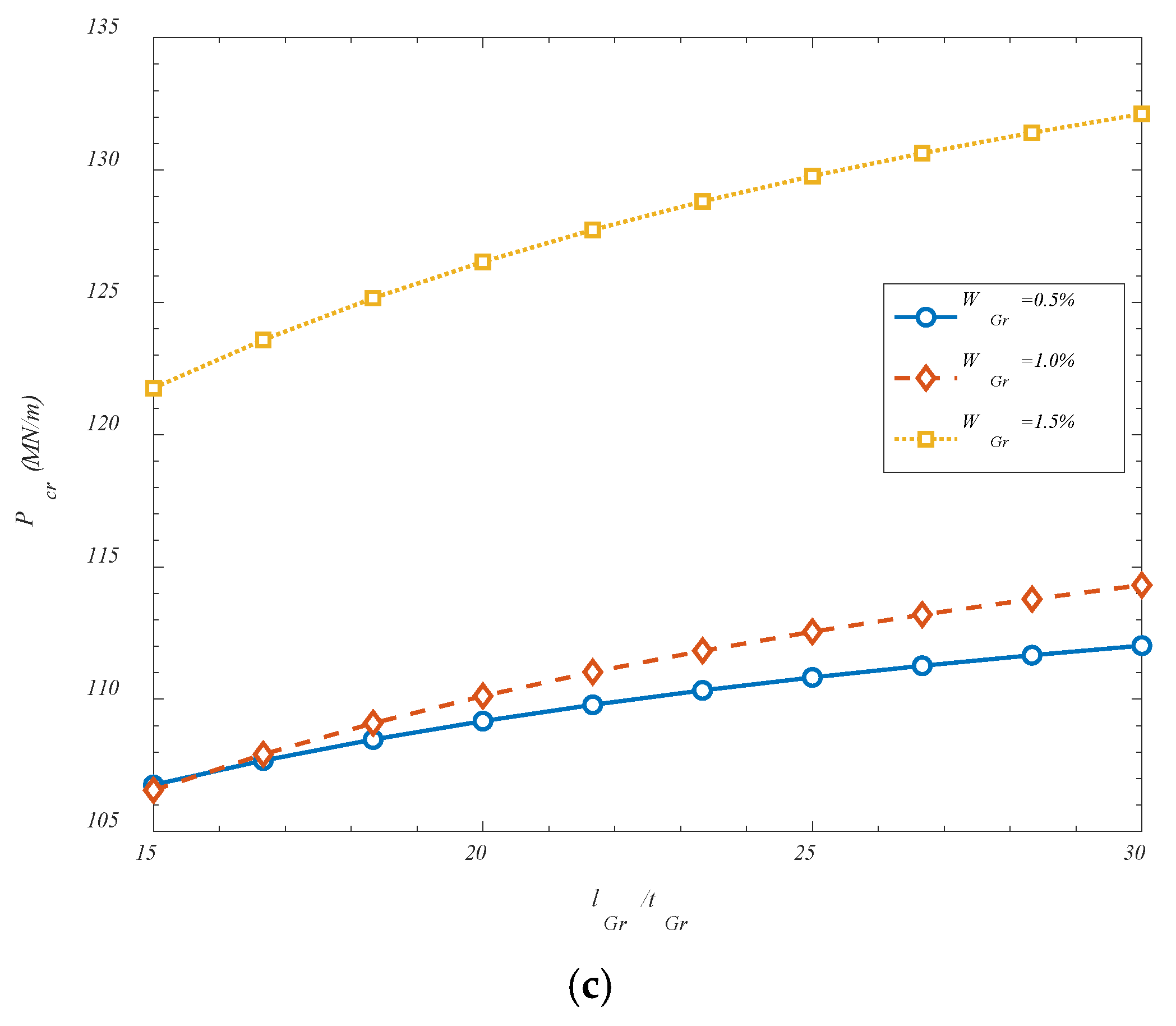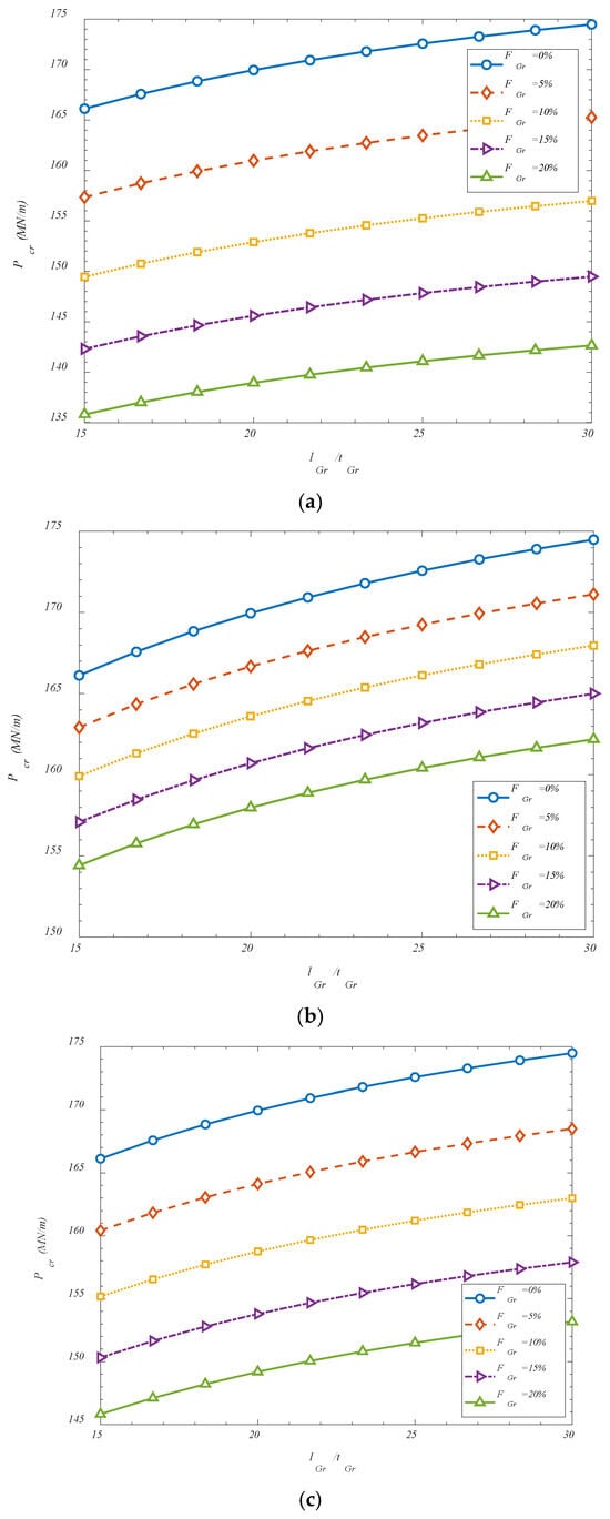 Figure 4. It is observed that an increase in the ratio of GOAM length to its thickness has been found to enhance the critical buckling load of the reinforced shell structure. This behavior can be attributed to the shift in the mechanical role of the GOAM phase as it becomes slenderer. When the length of the GOAM unit is increased relative to its thickness, the reinforcement layer behaves more like an extended membrane or plate element, contributing more effectively to in-plane stiffness and axial load transfer. In such cases, the GOAMs are capable of engaging a greater surface area of the shell, thereby distributing stresses more uniformly and suppressing localized instability. Moreover, thinner GOAMs are less likely to introduce concentrated stiffness discontinuities that could act as stress risers under compression. As the thickness is reduced, the reinforcement conforms more naturally to the curvature of the shell, maintaining geometric compatibility with the host structure and enhancing composite action. In this regime, the benefits of auxetic behavior—such as lateral expansion under axial strain—are more efficiently translated into buckling resistance, as the structure is able to resist deformation through coordinated in-plane mechanisms rather than local bending or shear. Thus, the increase in the length-to-thickness ratio improves the reinforcement efficiency of the GOAM layer, enabling it to contribute more directly to the global stability of the system. This enhanced structural engagement leads to higher critical buckling thresholds, particularly in shells operating under thermomechanical conditions.
