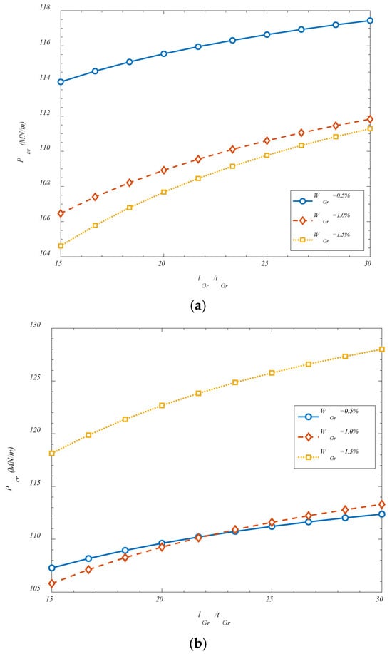 9, only negligible increases in critical buckling load are observed—approximately 0.005% and 0.46%, respectively. This marginal change indicates that at lower values of shear stiffness, the shear layer has a limited contribution to the global buckling behavior of the uniformly reinforced shell. However, when