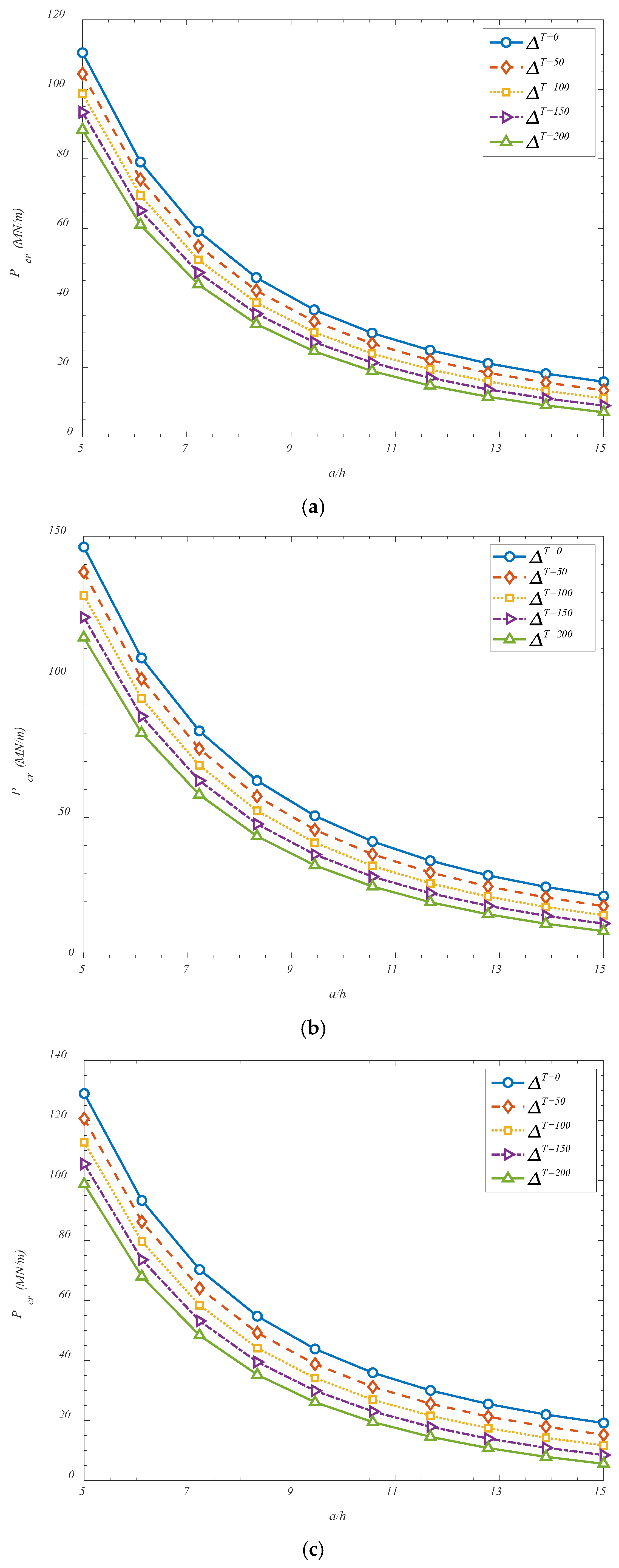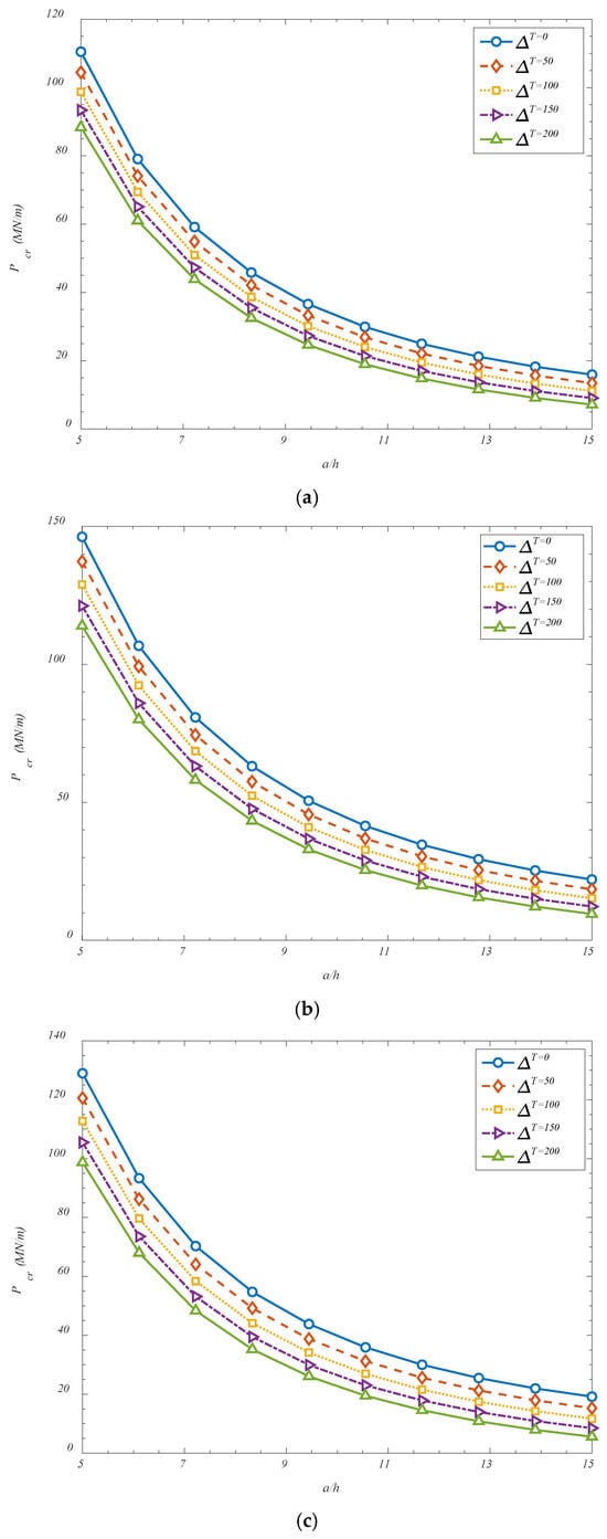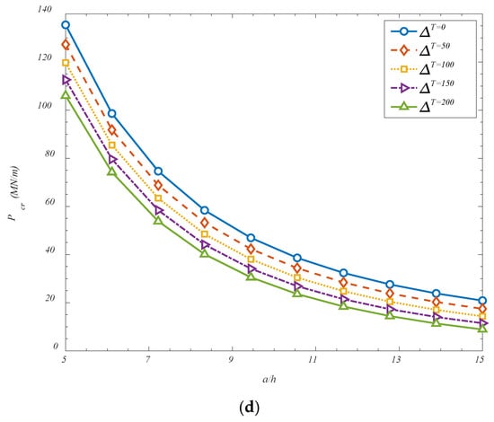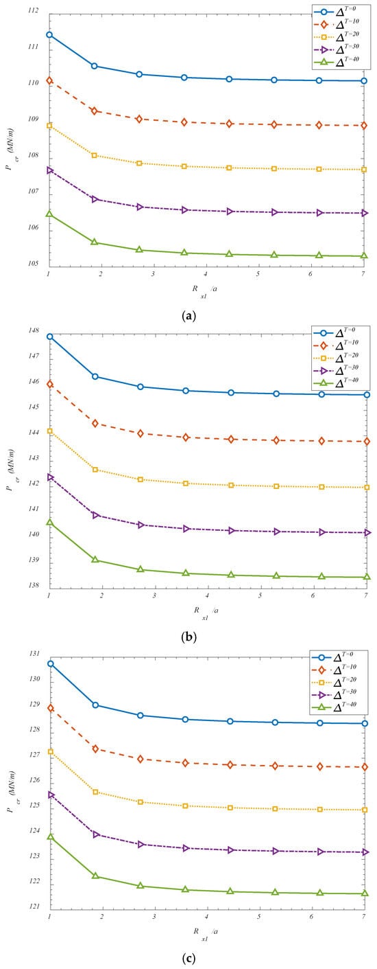 Figure 6 investigates the effect of temperature changes and also, the panels aspect ratio on the critical buckling loads. It is found that a reduction in the critical buckling load has been observed with increasing temperature difference across the shell, and this trend can be attributed to the thermomechanical effects induced within the composite system. As the temperature difference increases, additional thermal stresses are generated due to the mismatch in thermal expansion between the GOAMs and the surrounding matrix material. These thermally induced stresses act in conjunction with the applied mechanical loads and contribute to a preloading condition that brings the structure closer to its instability threshold. Moreover, elevated thermal fields tend to reduce the effective stiffness of the constituent materials, particularly in polymers or composites, leading to a softened structural response. The combined effect of thermal pre-stressing and material degradation under thermal loading causes the shell to become more susceptible to buckling, thereby lowering the critical buckling load. Additionally, it has been found that increasing the length-to-thickness ratio (