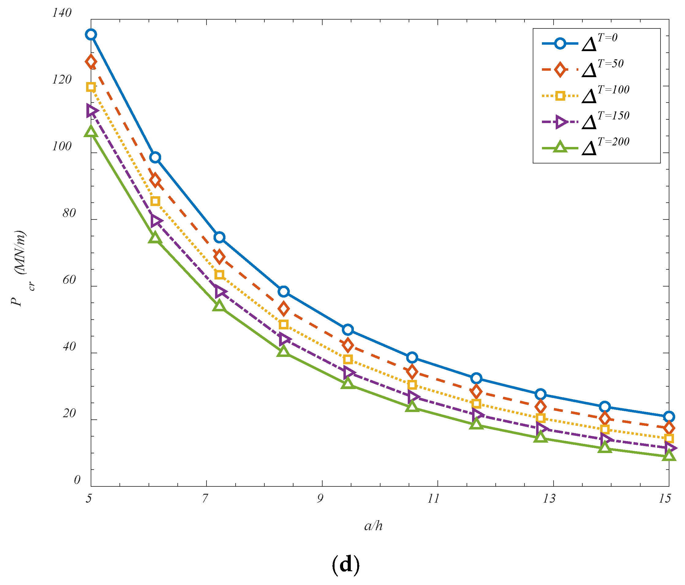 h) from 5 to 15 leads to a pronounced decrease in buckling strength. This behavior is fundamentally associated with the increasing slenderness of the shell structure. As the shell becomes longer and thinner, its flexural rigidity relative to its axial length diminishes, and the structure behaves more like a plate with reduced resistance to compressive loads. In slender shells, the deformation modes tend to localize more easily, and global instability is triggered at lower loads due to reduced bending and shear resistance. Furthermore, geometric imperfections and localized variations in stiffness—particularly in heterogeneous systems such as GOAM-reinforced shells—are more likely to affect slender structures, further compromising their stability. As a result, the increase in slenderness significantly lowers the load required to initiate buckling. These findings highlight the strong sensitivity of structural stability to both thermal environments and geometric proportions, and they underscore the importance of accounting for such parameters in the design of lightweight and thermally exposed shell systems.