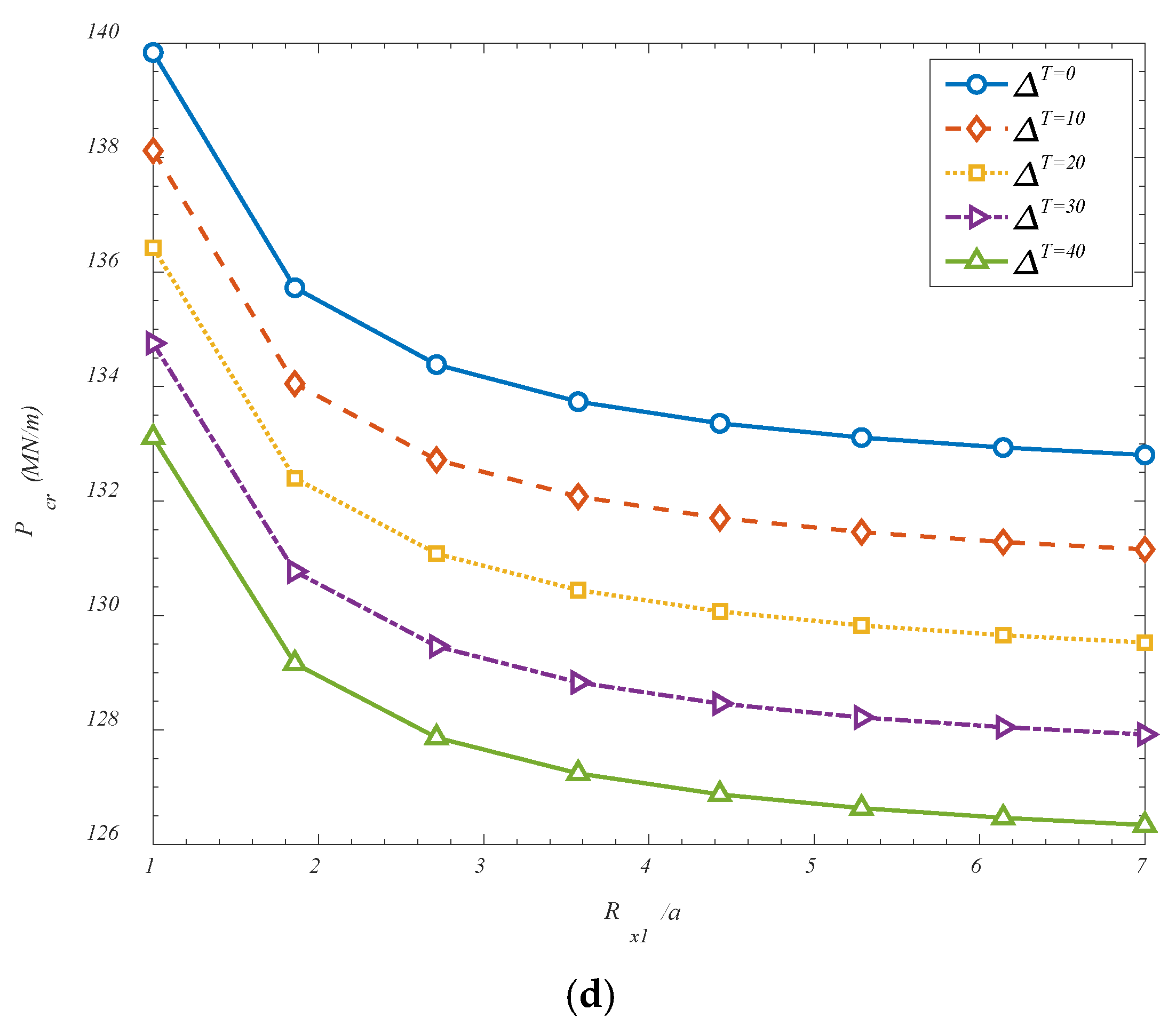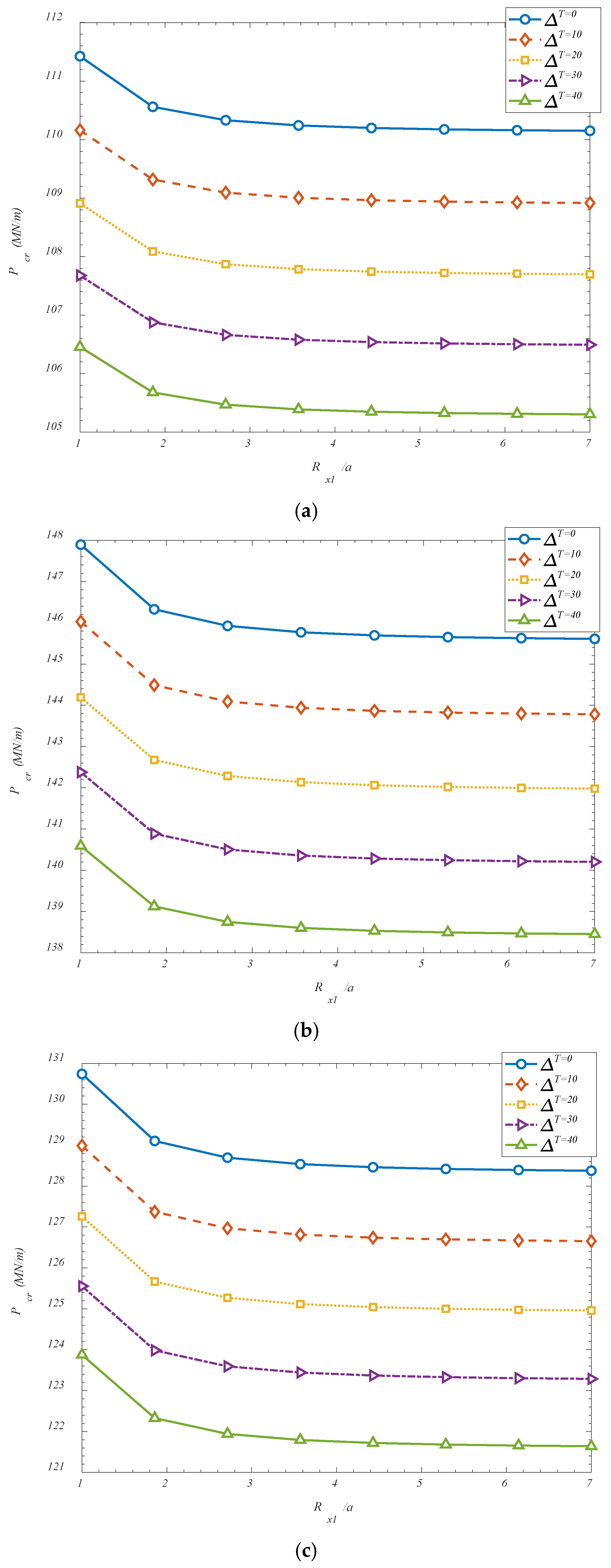 a increases, the shell becomes geometrically flatter in the longitudinal direction, gradually approaching the behavior of a cylindrical or even a plate-like structure. In this flattened configuration, the inherent geometric stiffness provided by the curvature is diminished, and the shell becomes more prone to instability under axial or in-plane compressive forces. The reduction in curvature weakens the shell’s ability to redistribute stresses through membrane action, which is one of the principal stabilizing mechanisms in curved structures. As a result, the shell relies more heavily on bending stiffness to resist buckling—an unfavorable condition, particularly in thin-walled configurations where bending stiffness is relatively low. Additionally, in flatter shells, the deformation modes tend to involve larger deflections and lower energy barriers to instability, leading to a decrease in the critical load threshold. The curvature radius effectively acts as a geometric stiffener; when it is reduced (i.e., curvature increases), the shell is better equipped to sustain compressive stresses without undergoing instability. Therefore, increasing