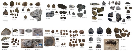 - Spherical artefacts: this category comprises bitumen objects characterised by a rounded morphology, including the following:(c1) Rounded artefacts: samples that have a rounded shape.(c2) Perforated artefacts: samples featuring a central hole (i.e., samples 28, 30, 33, and 55).(c3) Drop-shaped artefacts: samples that have a distinctive drop shape (i.e., samples 2, 9, 22, 23, 32, 34, and 36). They may represent intermediate storage forms of bitumen, possibly intended for later reuse within ongoing recycling processes. Indeed, they were found grouped within the workshop area of Abu Tbeirah.