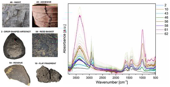 Some selected images and the FTIR spectra dataset. The spectra are shown with transparency to highlight overlapping peaks. Sample 2 (sky-blue) corresponds to bitumen with a distinctive drop shape; sample 10 (orange) refers to a bitumen fragment with a flat shape; sample 43 (turquoise) corresponds to the bitumen used as an adhesive to repair a ceramic sarcophagus; sample 46 (green) is a bitumen fragment coming from an ingot; sample 56 comes from a reed basket coated with bitumen; and sample 58 is a bituminous residue on a pottery vase. Samples 61 and 62 correspond, respectively, to the excavation soil and a modern bitumen standard used as references.