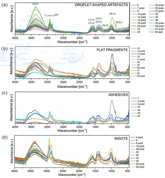 FTIR spectra of the samples grouped by classes: (a) Droplet-shaped artefacts, (b) Flat fragments, (c) Aadhesives and (d) Iingots.