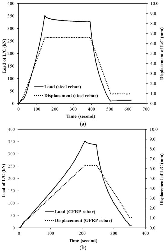 L/C displacements versus L/C load curves for the increased time under static loading. (a) Specimen using steel rebar; (b) Specimen using GFRP rebar.