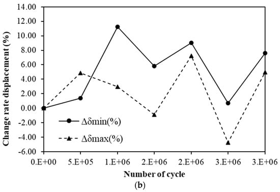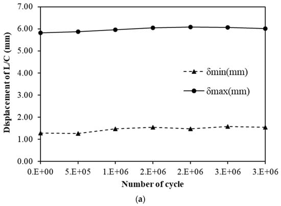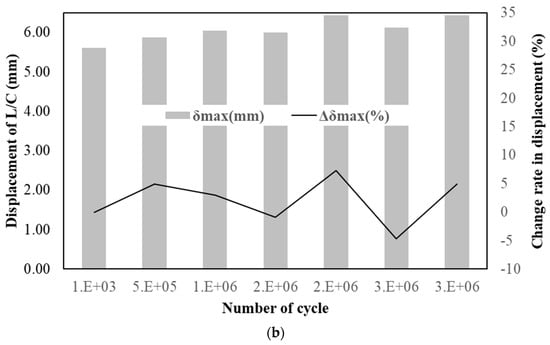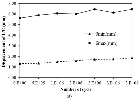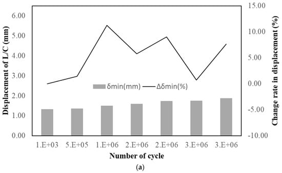 Variations in minimum and maximum L/C displacements for increased loading cycles (Steel rebar). (a) Minimum L/C displacement variations for the increased loading cycles; (b) maximum L/C displacement variations for the increased loading cycles.