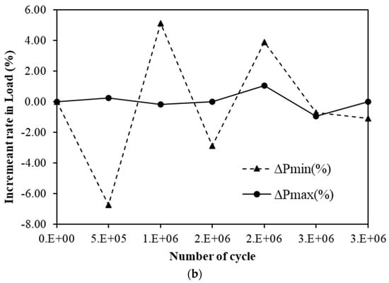 Figure 7 and Figure 8 compare the variations in L/C displacement and the trends in displacement change rate for GFRP- and steel-reinforced specimens under accumulated fatigue cycles (1 cycle: 10 kN → 264 kN → 10 kN). For both specimens, the displacement variation during repeated loading remained within 1 mm, indicating minimal change, and the rate of variation was found to decrease as the number of cycles accumulated. Figure 9 and Figure 10 shows comparison of the variations in L/C load and the trends in load change rate for GFRP- and steel-reinforced specimens under accumulated fatigue cycles. Similarly to the observations in Figure 8 and Figure 9, the load variation during repeated loading for both specimens remained within 10 kN, indicating minimal change, and the rate of variation decreased as the number of cycles increased. Figure 11 and Figure 12 present the variations in minimum and maximum L/C displacements and the corresponding change rates for GFRP- and steel-reinforced specimens under accumulated fatigue cycles. In Figure 11, the slight fluctuations in the increment rate suggest small elastic adjustments and microstructural accommodation during cyclic loading. Overall, no progressive increase in displacement of the steel reinforcement was observed up to 3 million cycles, confirming the long-term serviceability and deformation stability under repeated loading. In the case of the GFRP reinforcement (Figure 12), the small fluctuation in the increment rate reflects minor elastic adjustments rather than progressive degradation. Overall, the GFRP specimen maintained consistent stiffness and exhibited no significant increase in displacement, confirming its excellent fatigue resistance.