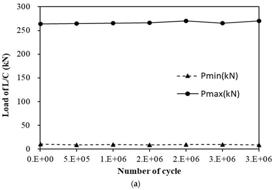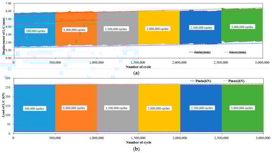 Figure 13 and Figure 14 present the L/C load–displacement responses of the two specimens under 1 to 3 million repeated loading cycles, as well as the variations in L/C displacement and L/C load with accumulated loading cycles. The results indicate that displacement increased slightly as the number of loading cycles progressed; however, the final displacement variation remained within 1 mm, indicating minimal change. Furthermore, while a slight increase in displacement was observed with cycle accumulation, the load variation was found to be negligible. Based on the experimental results, it can be concluded that the variation in load cell displacement with accumulated cycles was minimal, indicating the potential to ensure long-term serviceability. In addition, the small variation in load cell load with cycle accumulation suggests that dynamic structural stability and fatigue resistance can be adequately maintained.