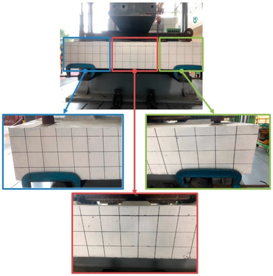 Figure 3 and Table 1 provide detailed information on the loading protocol adopted for the long-term fatigue tests. As summarized in Table 1, the design axle load was 220 kN, in accordance with high-speed railway design standards []. The fatigue load was calculated by applying an impact factor (i) to the design axle load, resulting in a wheel load of 132 kN (i.e., 220/2 × 1.2). As illustrated in Figure 3, loading was first increased to the design load level (Fd), followed by cyclic loading between the minimum load (Fmin) and the reference load (F0). As mentioned earlier, the fatigue test was carried out for a total of 3 million cycles with 3 Hz loading frequency, during which the maximum deflection and crack propagation of the specimen were monitored. Figure 4 shows an overview of the fatigue testing setup.