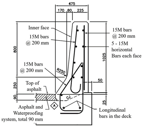 - Patel, G.; Sennah, K.; Azimi, H.; Lam, C.; Kianoush, R. Development of Precast Concrete Barrier Wall System for Bridge Decks. J. Prestress. Concr. Inst. (PCI) Winter 2014, 2014, 83–102. [Google Scholar] [CrossRef]