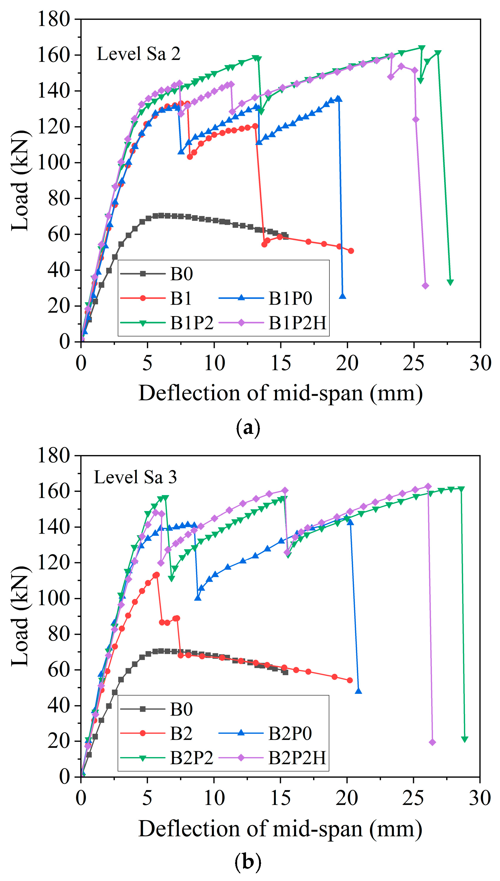 Figure 7b. Under the Sa2 sandblasting grade, the specimen B1P0 with end anchors exhibited an ultimate load 12.2 kN higher than the unanchored specimen B1. This improvement is primarily attributed to the end anchors allowing the CFRP plate to continue carrying load after full-length debonding, thereby enhancing the safety reserve of the strengthened steel beam. Meanwhile, the prestressed specimen B1P2 showed an ultimate load increase of 26 kN compared with the non-prestressed B1P0, whereas the difference between B1P2H after 90 hygrothermal cycles and B1P2 was only 1.9 kN. Specimens under the Sa3 sandblasting grade exhibited similar trends (B2 was excluded due to insufficient adhesive curing). The prestressed B2P2 had an ultimate load 16.1 kN higher than the non-prestressed B2P0, with only a 1.2 kN reduction after 90 hygrothermal cycles (B2P2H). Overall, the hygrothermal environment has a significant effect on adhesive cracking load but a relatively minor effect on ultimate load. This indicates that hygrothermal aging primarily accelerates interfacial degradation; however, when end anchors are employed, its impact on the overall load-carrying capacity of the strengthened beams is limited.