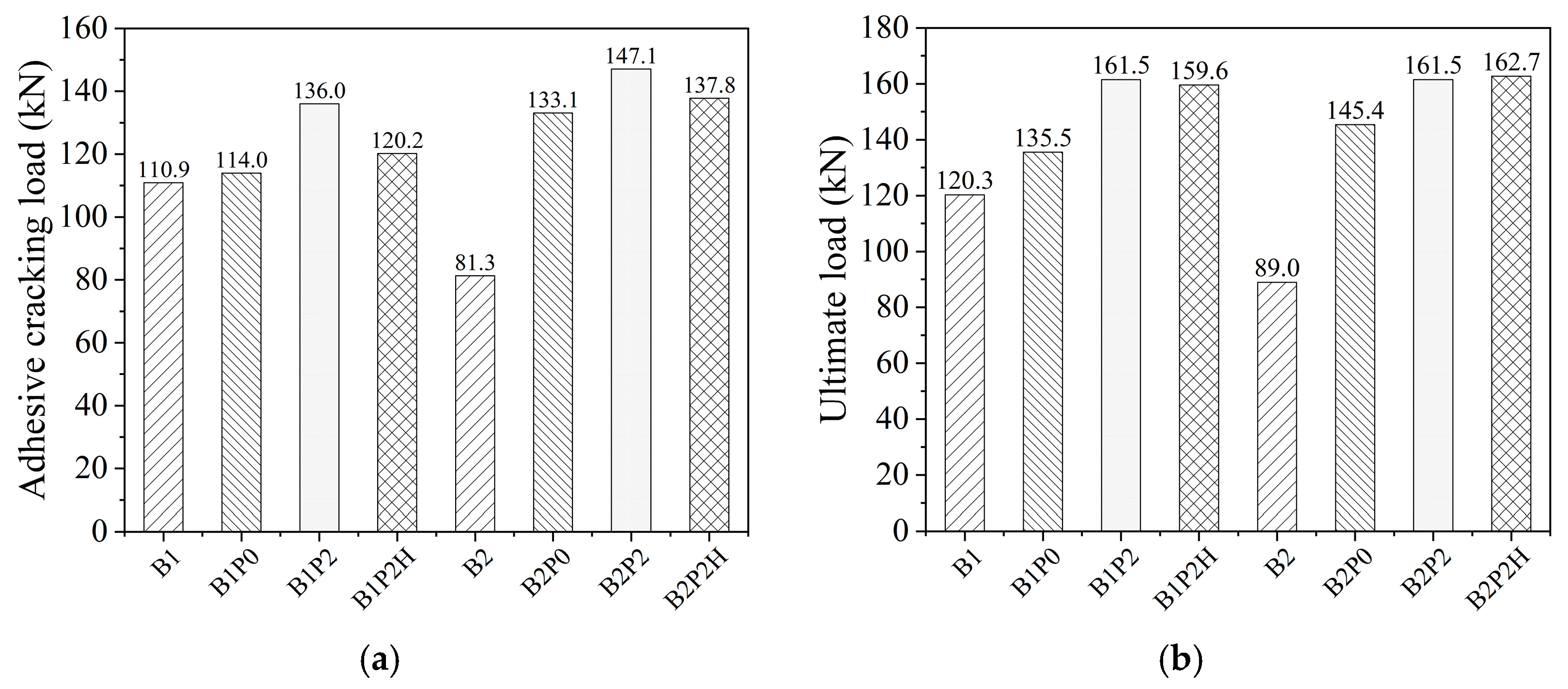 Figure 7a. As previously noted, specimen B2 exhibited a lower cracking load due to insufficient adhesive curing. Comparison between non-prestressed and prestressed specimens indicates that the application of prestress significantly increased the adhesive cracking load and effectively delayed adhesive failure. Under the Sa2 sandblasting grade, the prestressed specimen B1P2 showed a 19.3% increase in adhesive cracking load compared with the non-prestressed B1P0, whereas after 90 hygrothermal cycles, B1P2H decreased by 11.6% relative to B1P2. Under the Sa3 sandblasting grade, the prestressed specimen B2P2 exhibited a 10.5% increase over B2P0, and B2P2H decreased by 6.3% after 90 hygrothermal cycles. Moreover, the variation in cracking load for Sa3 specimens was smaller than that for Sa2 specimens. Further comparison between specimens with different surface roughness under the same conditions shows that B2P0 increased the cracking load by 19.1 kN relative to B1P0, B2P2 increased by 11.1 kN relative to B1P2, and B2P2H increased by 17.6 kN relative to B1P2H. These results indicate that higher surface roughness effectively enhances interfacial bond strength and the corresponding adhesive cracking load, and better mitigates the deterioration of the interface under hygrothermal conditions.