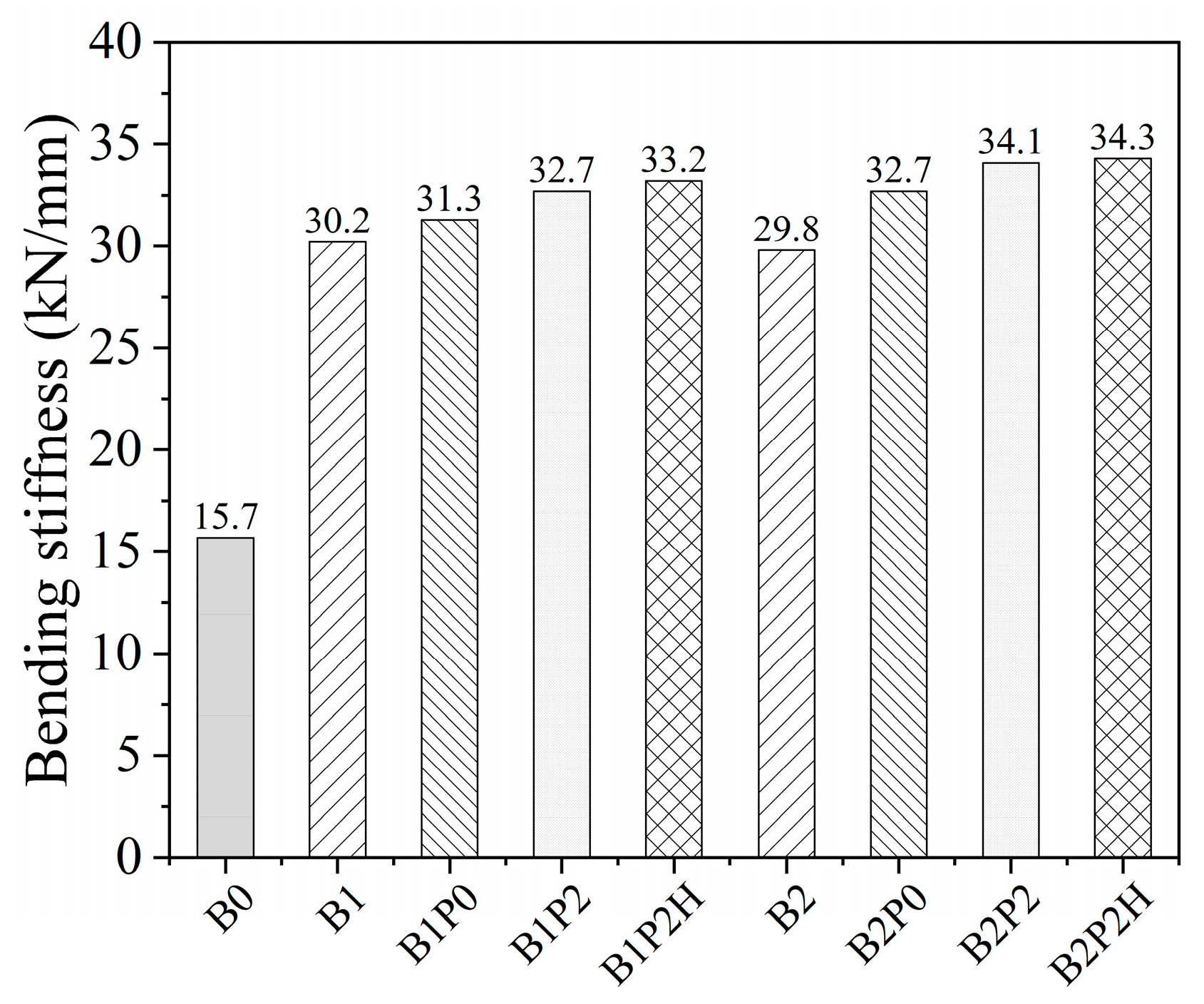 Figure 8. Compared with the reference specimen B0, all strengthened specimens exhibited a significant increase in elastic-stage stiffness. Non-prestressed specimens with different surface roughness showed similar stiffness improvements, approximately 91.1%, whereas prestressed specimens exhibited an overall increase of about 112.7%. Notably, the additional contribution of prestress to stiffness was not significant compared with non-prestressed specimens, consistent with previous studies [
