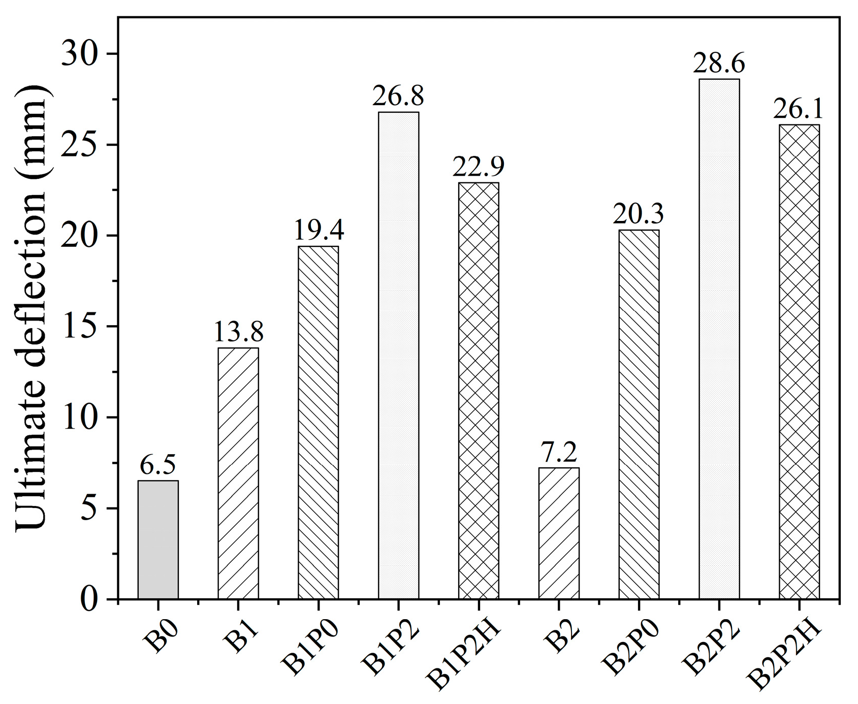 Figure 9. Compared with the reference specimen B0, the ultimate deflections of unanchored specimens B1 and B2 increased by 112.3% and 10.8%, respectively. The lower ultimate deflection of B2 is attributed to premature interface debonding caused by insufficient adhesive curing. For unanchored strengthened beams, the CFRP plate tends to propagate debonding rapidly toward the plate ends, eventually resulting in complete end debonding and failure of the strengthening system. In contrast, strengthened beams with end anchors exhibited substantially higher ultimate deflections, regardless of prestress application, with increases ranging from 3.0 to 4.4 times. This indicates that end anchors effectively inhibit plate-end debonding and enhance the ductile reserve of the beams. The hygrothermal environment has a moderate adverse effect on the ultimate deflection of the strengthened beams. For Sa2 sandblasted specimens, the ultimate deflection of B1P2H decreased by 14.6% compared with B1P2, while for Sa3 specimens, B2P2H decreased by 8.7% relative to B2P2. These results demonstrate that higher steel surface roughness helps mitigate deflection degradation under hygrothermal conditions.