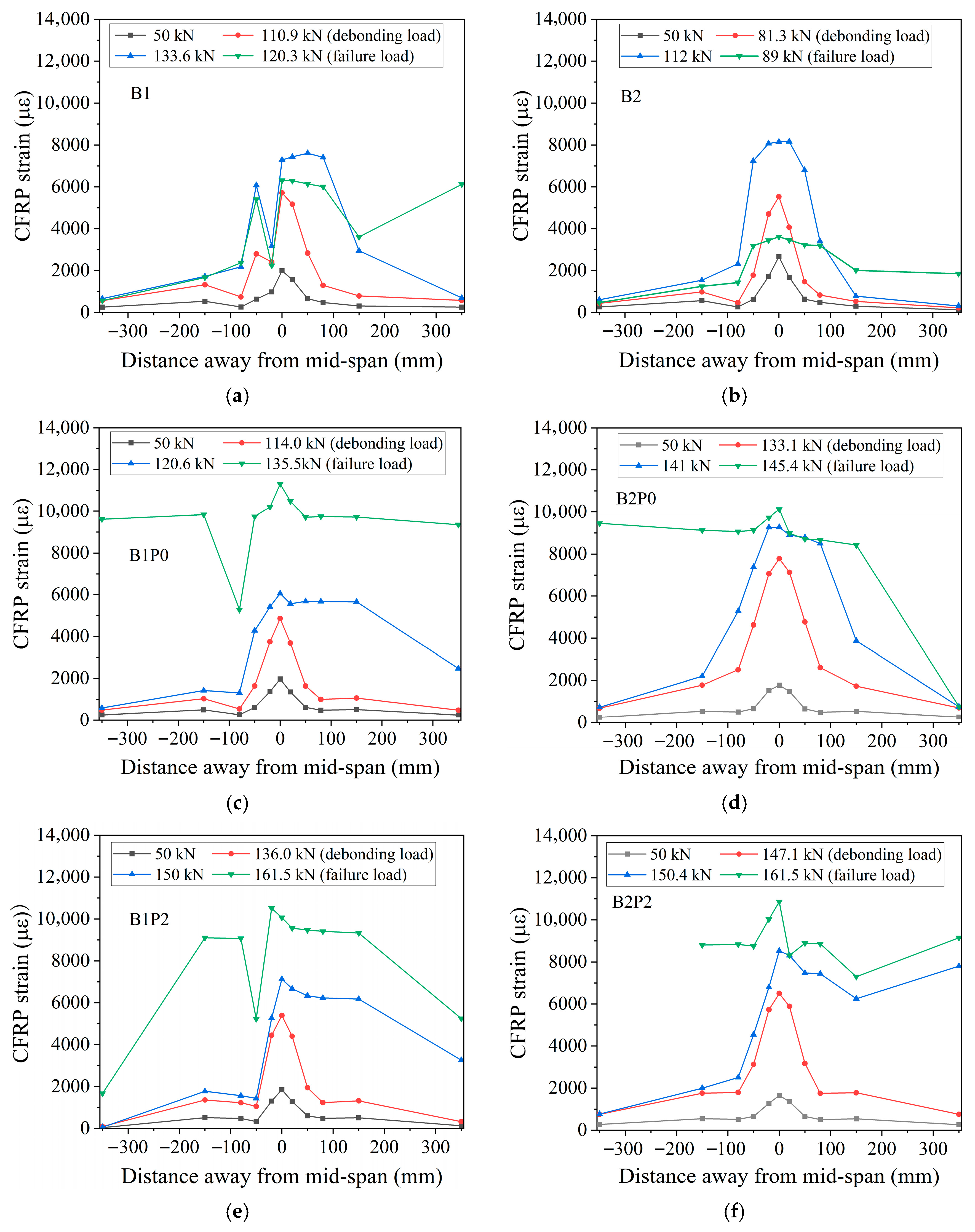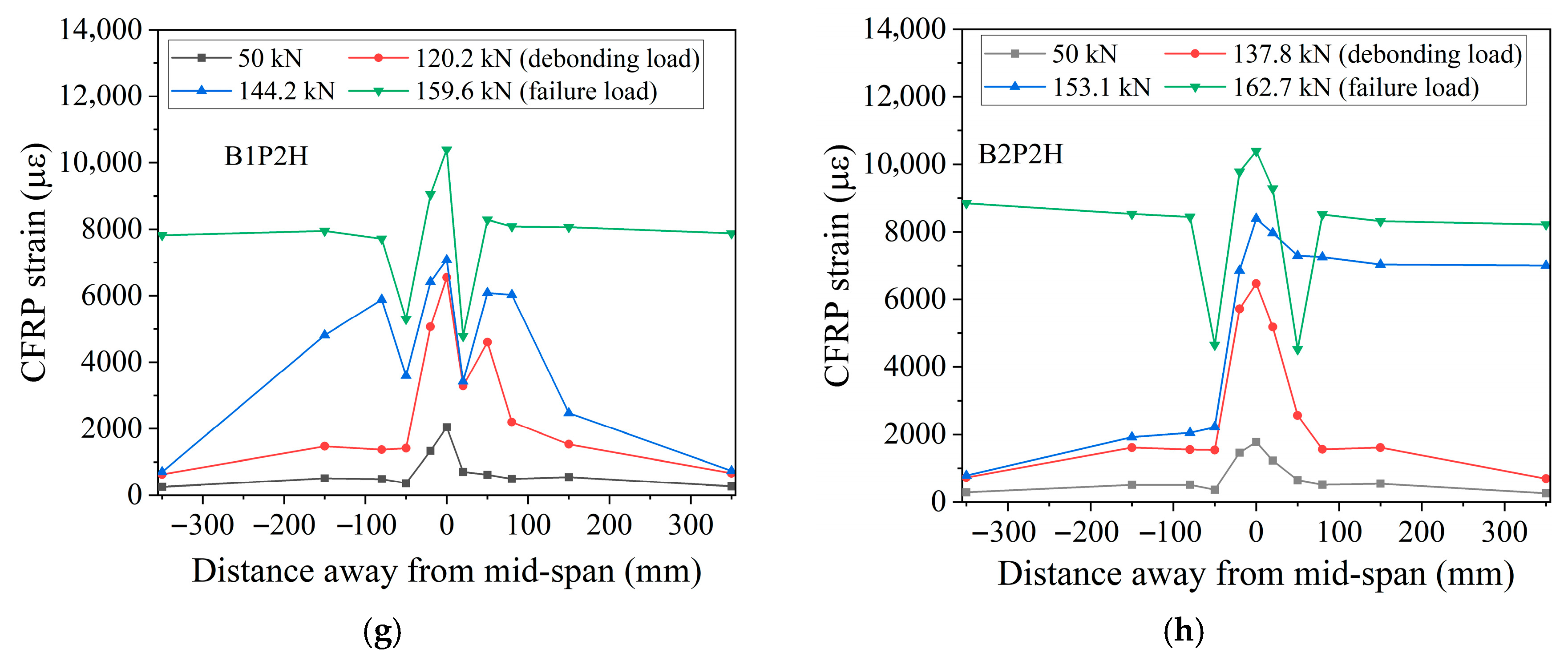 Figure 10 presents the strain distribution curves of the CFRP plates at various load levels for all specimens. It should be noted that one strain gauge near the end anchor of Specimen B2P2 failed in the later stage of loading; therefore, there is one missing data point in the curve under the failure load. As shown, all specimens exhibited stress concentration at the midspan crack. Under the same load, the CFRP strain gradually decreased from the midspan defect toward the plate ends. With increasing load, the stress concentration became more pronounced: when the load reached the adhesive cracking load at the CFRP–steel interface, the strains on both sides of the defect approached those at the midspan crack. As the load increased further, strains around the defect continued to rise, and the high-stress zone gradually extended toward the plate ends. When interfacial debonding approached the end anchor locations, strains farther from the midspan also increased significantly. However, due to the anchoring effect provided by the end anchors, the specimen can sustain the load continuously. At ultimate load, the CFRP plate was almost fully debonded along its length, and the strain distribution became relatively uniform. For the specimens without end anchors (B1 and B2), due to the long bonding length of the CFRP plates, after the first interfacial debonding occurred, the load dropped suddenly, but the CFRP plates did not debond completely, and the strengthened beams could still maintain their load-carrying capacity. However, when the load increased only slightly afterward, one end of the CFRP plates underwent complete debonding, and the strengthened beams finally lost their load-carrying capacity. As a result, the strain at the ultimate load showed a decreasing trend. In addition, compared with the specimens with end anchors, the high-strain areas of the specimens without end anchors were smaller and only concentrated in the mid-span region. These results demonstrate that end anchors effectively enhance the load-carrying capacity of the specimens and allow the high-strength potential of the CFRP plates to be fully utilized.